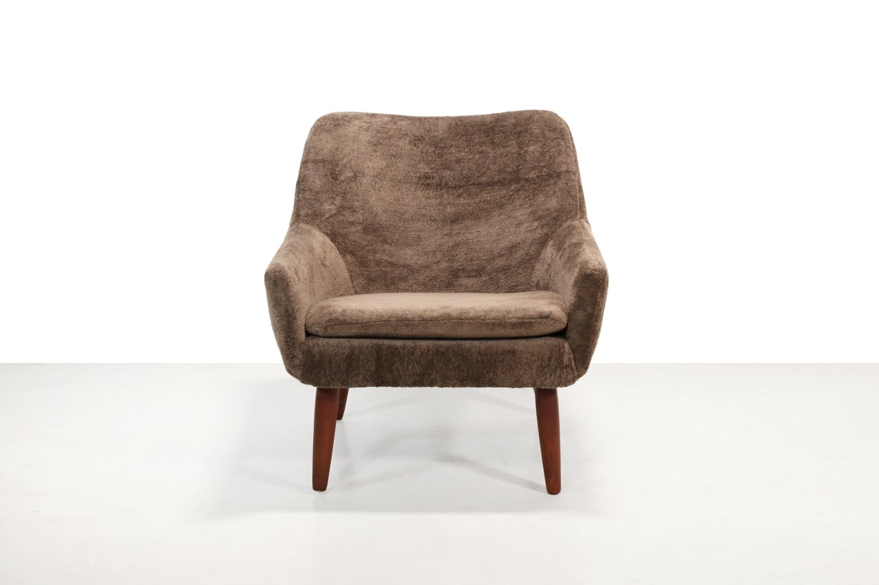 Omschrijving: Teak Deens design fauteuil met armleuningen en teakhouten pootjes in een luxe bruin grijze faux sheepskin stoffering. Wel de look van een huid, maar met een beter geweten.