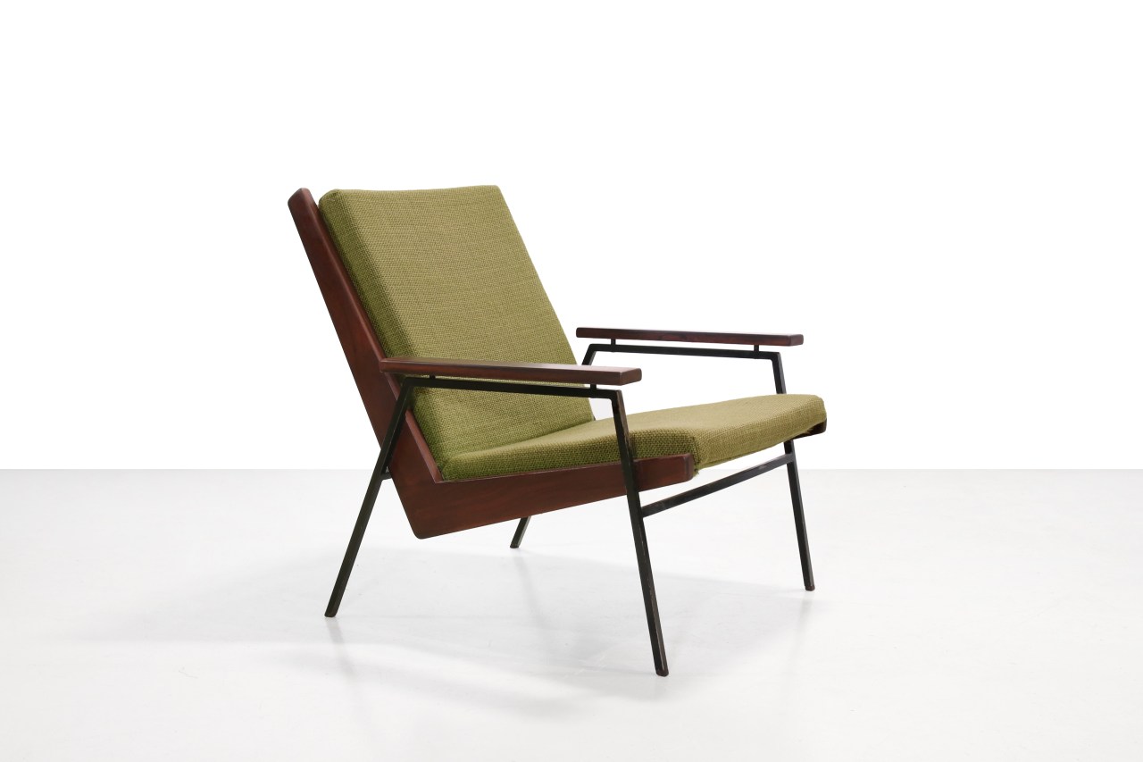 Omschrijving: Nederlandse design fauteuil ontworpen door Rob Parry voor Gelderland. Het model genaamd ‘lotus’ is gemaakt van een stalen onderstel, massief houten frame, palissander houten armleggers, rubberen singels en gestoffeerde schuimrubberen kussen. De originele groene stof is 100% wol. Deze fauteuil heeft een prachtige typische Nederlands minimalistisch ontwerp en zit ook nog eens heerlijk.