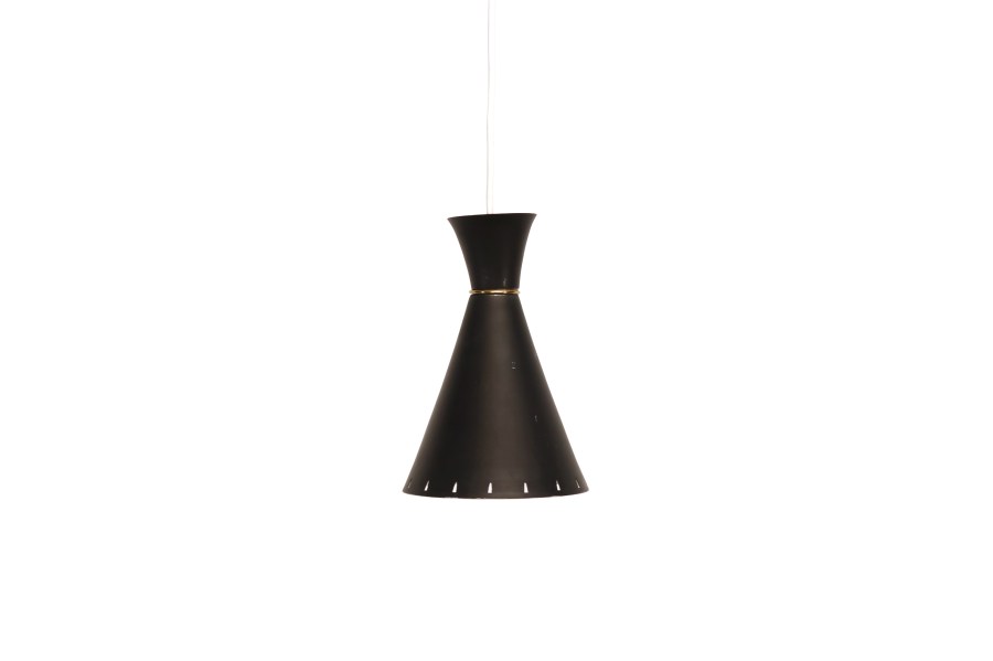 Omschrijving: Mooie vintage diabolo hanglamp in zwart en messing uit Denemarken. De lamp doet heel erg denken aan de ontwerpen van Sven Aage Holm Sorensen. Gelijke modellen zijn online ook onder deze naam te vinden. Helaas is de lamp zelf niet gemerkt. Prachtige eye-catcher, ook als de lamp uit staat.