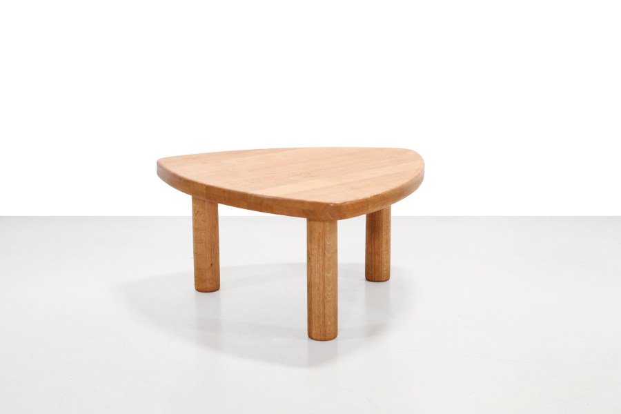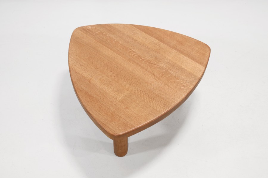 Omschrijving: Vintage eiken bijzettafel in de stijl van Pierre Chapo, met het iconische driepootontwerp. Het massief eiken blad en de speelse minimalistische vorm maken het een tijdloze en multifunctionele toevoeging aan iedere ruimte. Het is een mooie oude tafel, waar een specialist voor ons naar heeft gekeken. Deze bevestigd dat de tafel erg lijkt op model T23 en qua leeftijd, formaat en gebruik van hout overeenkomt met de eerste editie tafels die zijn ontworpen door Pierre Chapo. De dikte en de houtverbindingen van het blad van het tafeltje zijn daarentegen een beetje anders, waardoor het lijkt op een oude duplicaat. Voor wie een oude door Chapo geïnspireerde tafel wilt hebben, voor een niet Chapo prijs, is deze tafel op het lijf geschreven. De tafel is 64 bij 64 cm en is 32 cm hoog.