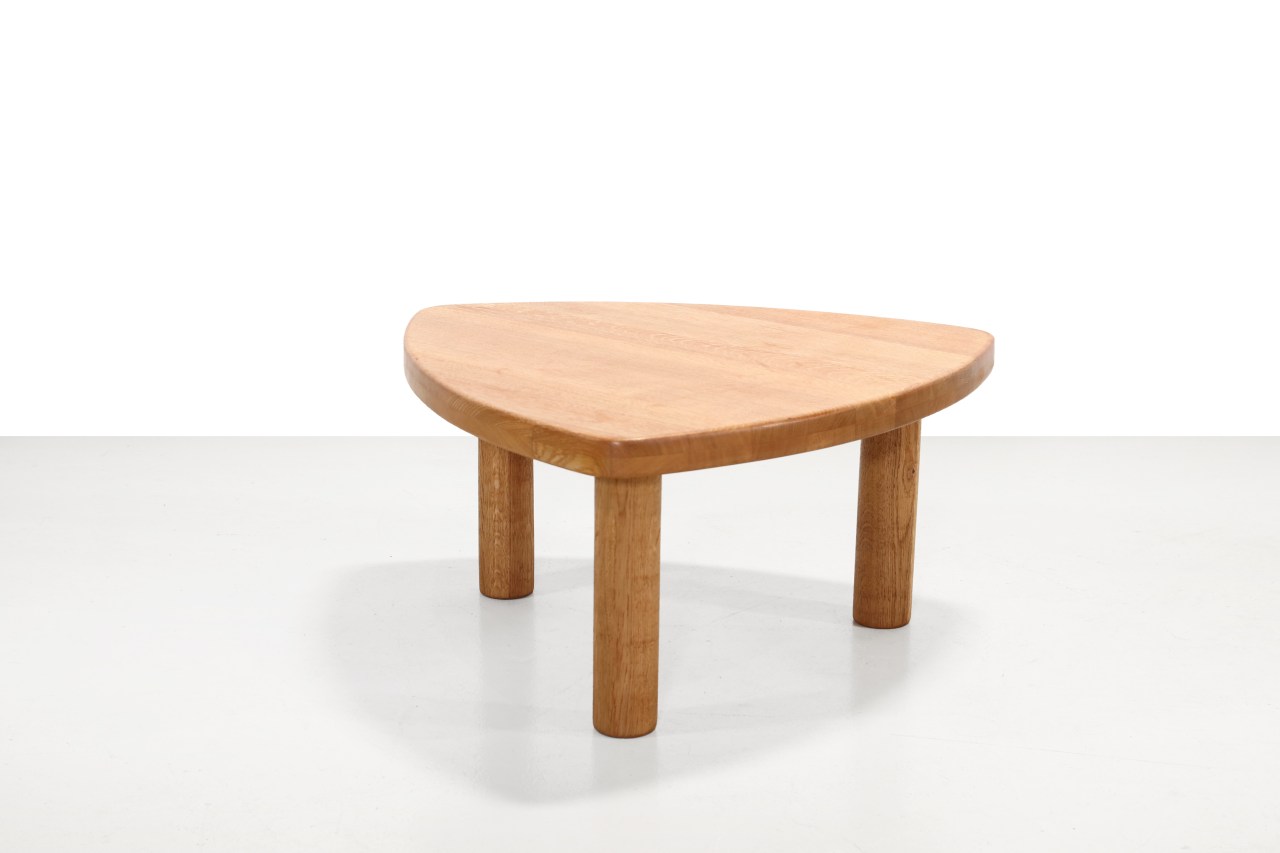 Omschrijving: Vintage eiken bijzettafel in de stijl van Pierre Chapo, met het iconische driepootontwerp. Het massief eiken blad en de speelse minimalistische vorm maken het een tijdloze en multifunctionele toevoeging aan iedere ruimte. Het is een mooie oude tafel, waar een specialist voor ons naar heeft gekeken. Deze bevestigd dat de tafel erg lijkt op model T23 en qua leeftijd, formaat en gebruik van hout overeenkomt met de eerste editie tafels die zijn ontworpen door Pierre Chapo. De dikte en de houtverbindingen van het blad van het tafeltje zijn daarentegen een beetje anders, waardoor het lijkt op een oude duplicaat. Voor wie een oude door Chapo geïnspireerde tafel wilt hebben, voor een niet Chapo prijs, is deze tafel op het lijf geschreven. De tafel is 64 bij 64 cm en is 32 cm hoog.