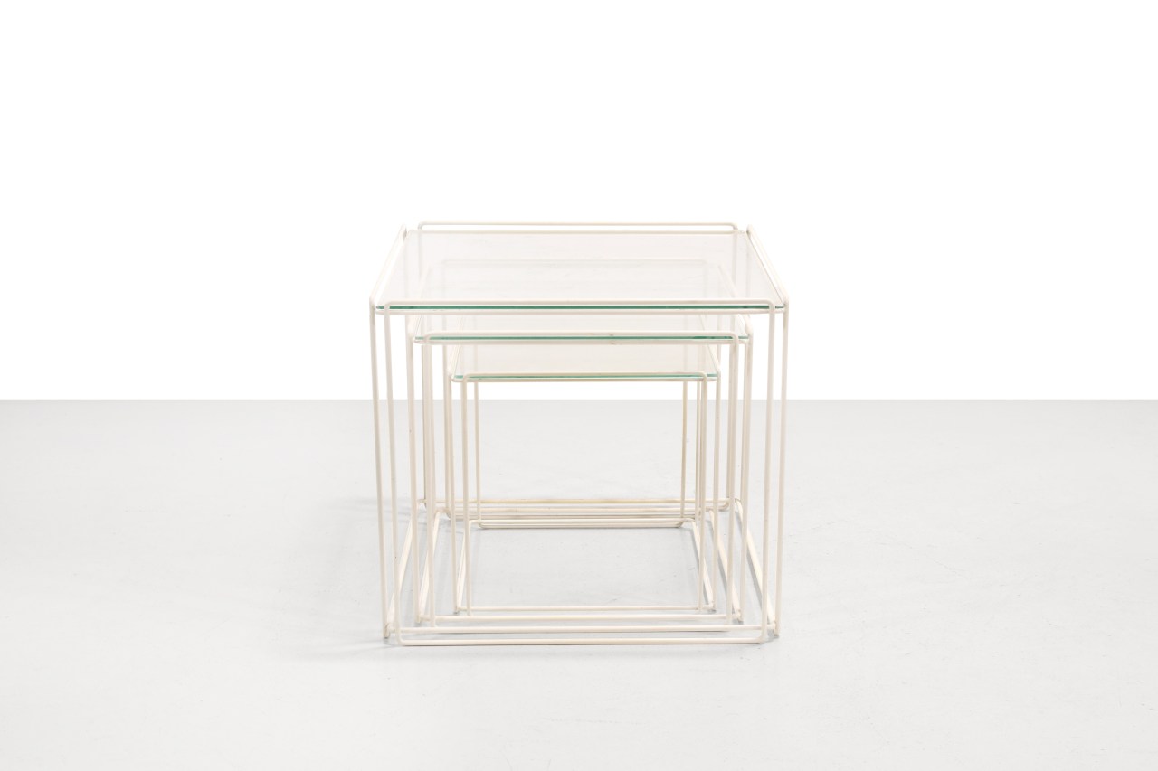 Omschrijving: Mooie set bijzettafels ontworpen door Max Sauze en gemaakt van wit draadstaal en glazen tafelbladen. De glazen tafelbladen liggen los op het frame wat de lijnen strak en simpel houdt. Vooral het kubistische lijnenspel is echt prachtig aan deze tafels. Behalve dat ze erg mooi zijn, zijn ze ook multifunctioneel. Je kunt ze onder elkaar geschoven neerzetten, maar ook alle drie los in de ruimte als je ergens ineens een bijzettafel nodig hebt of bijvoorbeeld een plantentafeltje. Je kunt ze ook neerzetten als een groepje en gebruiken als salontafel. Mogelijkheden genoeg.