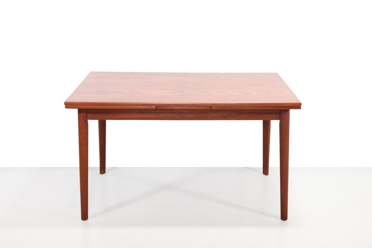 Omschrijving: Vintage Deense eetkamertafel uitgevoerd in teakhout welke verlengd kan worden. De extra bladen zijn mooi geïntegreerd in het ontwerp opgeborgen onder het blad. De tafelbladen zijn afgewerkt met massief teakhouten randen, waardoor de randjes nog in mooie staat zijn. De afgeronde taps toelopende poten zijn een prachtig detail. De tafel is 130 cm lang, 85 cm diep en 75 cm hoog. De extra bladen zijn elk 50 cm, waardoor als alle bladen uitgeschoven zijn de tafel 230 cm lang is.