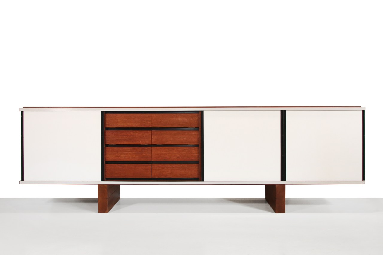 Omschrijving: Uniek en zeldzaam dressoir. Speciaal gemaakt voor een woning aan de Breitnerlaan in Utrecht tegenover ‘huis Theissing’. Gerrit Rietveld, die in dezelfde straat 2 villa’s ontwierp was nauw betrokken in de volkswoningbouw bij de wederopbouw in dit deel van Utrecht. De interieurarchitect van de woning waaruit dit dressoir komt heeft in samenwerking met Rietveld het interieur ontworpen. Dit dressoir is handgemaakt speciaal voor de woning. Gemaakt van massief hardhout en wit formica.