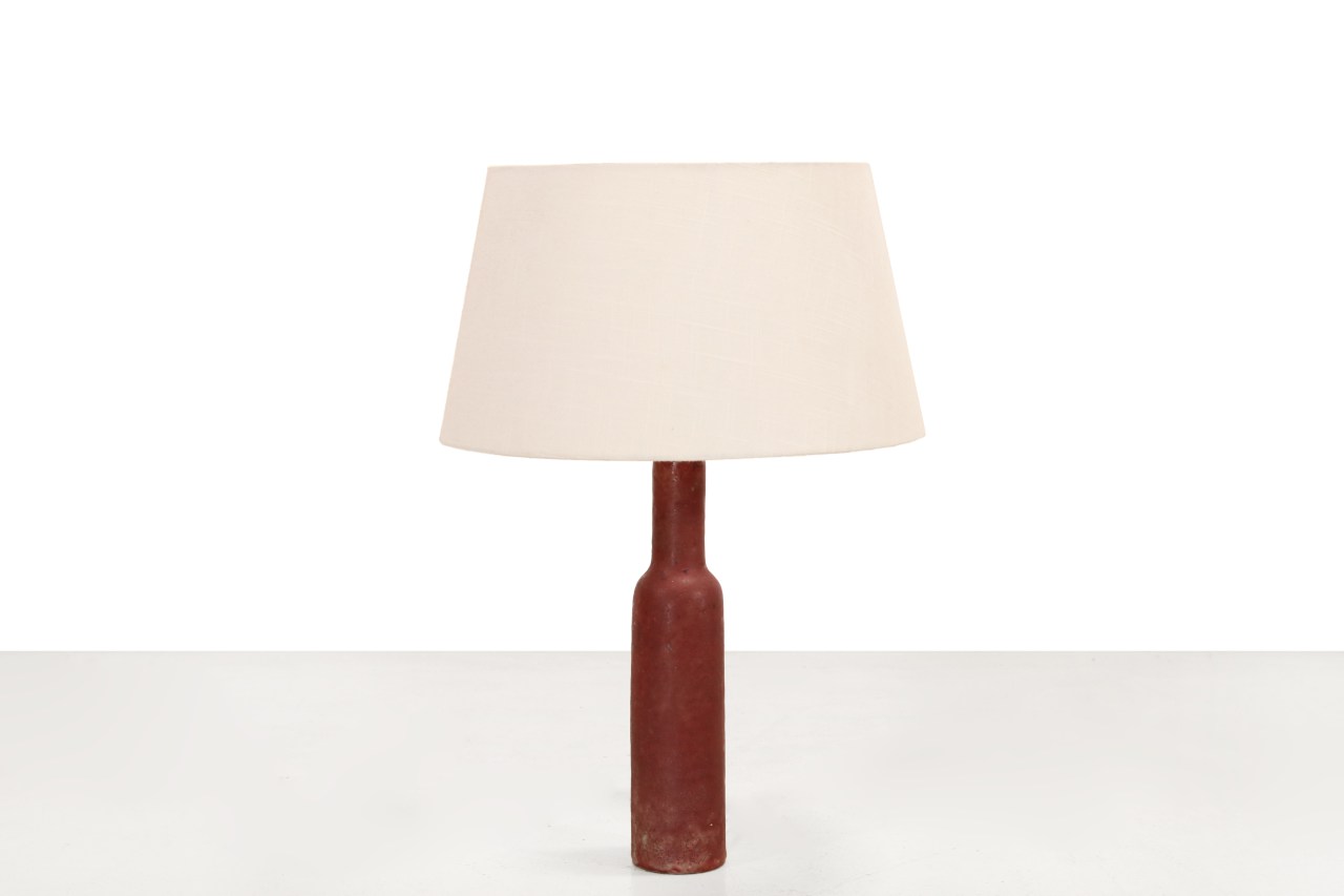 Omschrijving: Prachtige vintage rood geglazuurde tafellamp ontworpen door Piet Knepper voor Mobach. De lamp is in totaal 58 cm hoog en de kap heeft een diameter van 40 cm.