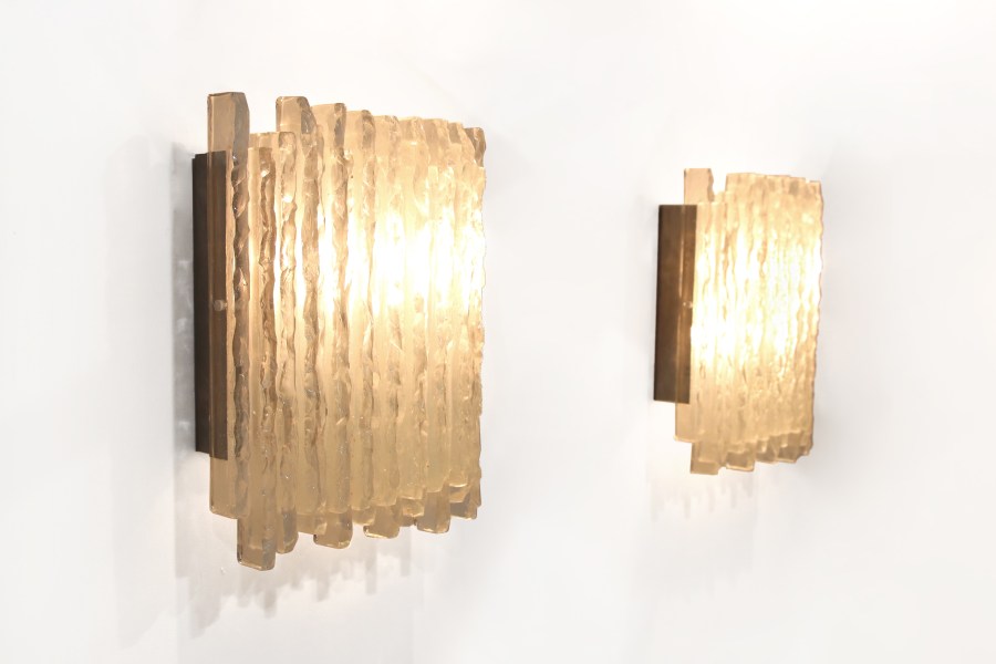 Omschrijving: Zeldzame set van twee Poliarte Vesta wandlampen van Albano Poli. Deze prachtige Brutalistische lampen zijn vervaardigd uit handgemaakte gehamerd glazen staven waardoor het onregelmatige motief betoverende patronen van licht en schaduw creëren. De lamp kan als wand- of plafondlamp worden gebruikt en heeft een stevige metalen ophanging. De Vesta-lampen zijn statement pieces voor elk interieur. De lampen zijn 35 cm breed, 26 cm hoog en zijn 10 cm diep.
