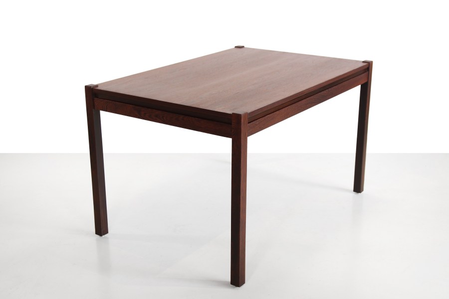 Omschrijving: Rechthoekige tafel gemaakt van het prachtige Wengé Hout. De tafel komt uit de jaren 70. Naar alle waarschijnlijkheid afkomstig uit Nederland of België. Helaas is de fabrikant ons onbekend. De tafel is geschikt voor 4 personen en heeft een afmeting van 126 cm in lengte, 86 cm breed en de tafel is 76 cm hoog. De stoelen zijn verkocht. De tafel is beschikbaar.