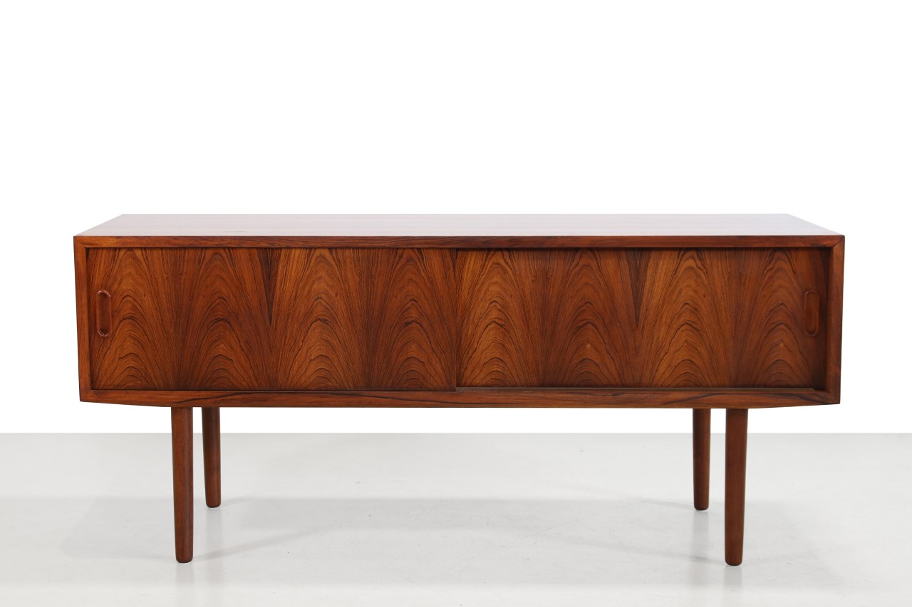 Omschrijving: Erg mooi palissander dressoir van Carlo Jensen voor Poul Hundevad. Gemaakt van Palissander fineer met een erg mooie tekening. De kast heeft twee schuifdeuren en is gemerkt. Dit bijzondere formaat maakt hem erg veelzijdig. De kast is 138,5cm breed, 43cm diep en 62cm hoog.