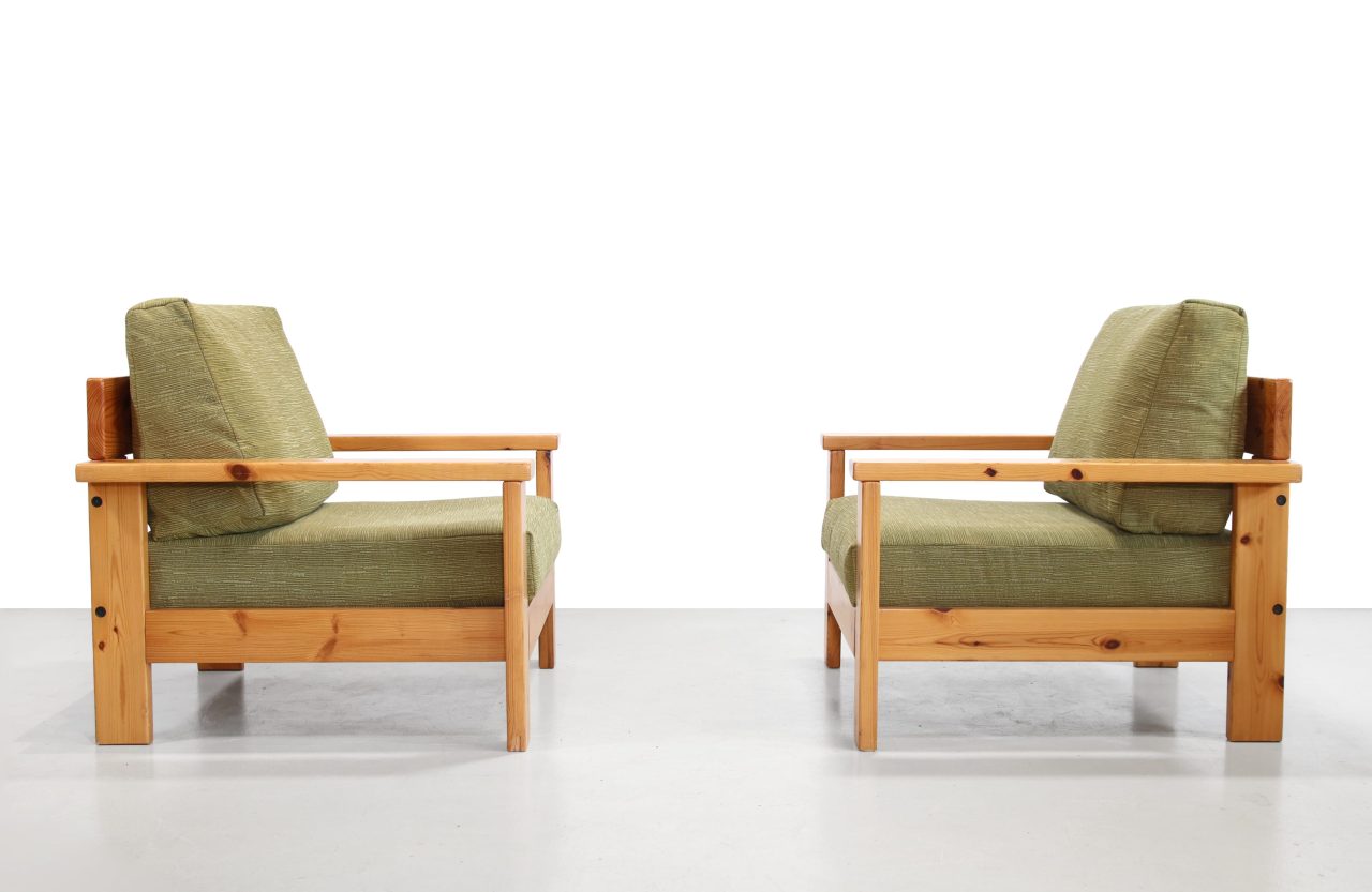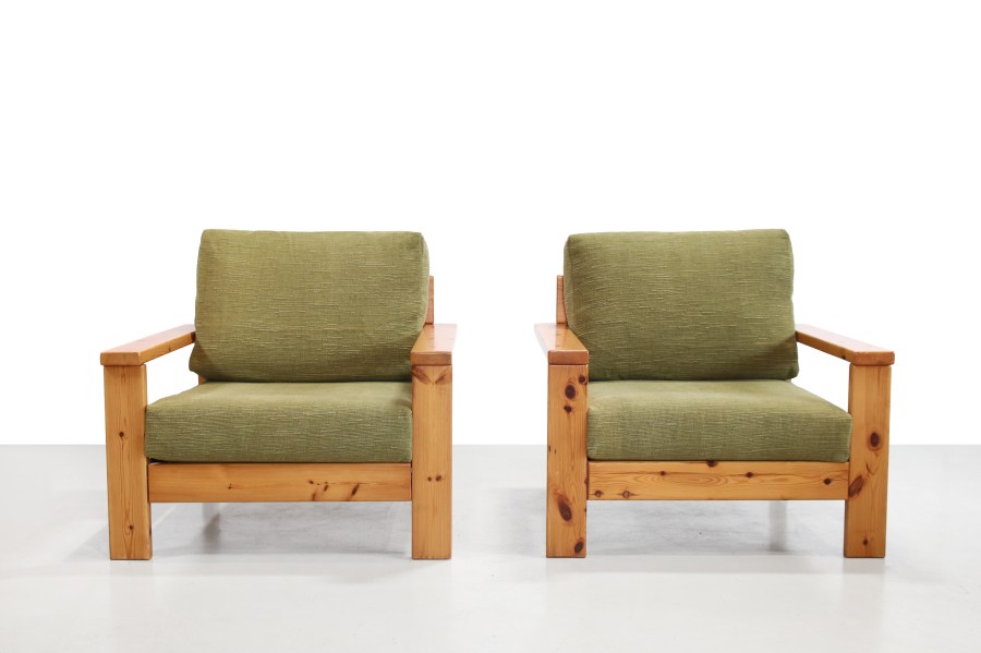 Omschrijving: Gave set Brutalistische grenen fauteuils. Wij hebben de stoelen gekocht in het Noorden van Italie, maar zouden ook goed uit Frankrijk kunnen komen. De massief grenen stoelen uit de jaren 70 zijn opnieuw gestoffeerd in een hoogwaardige groene Italiaanse design stof. Wij hebben een aantal meters zware katoenen deadstock stof, ook uit de jaren 70, kunnen kopen met een prachtig werkje wat de stof zijn reliëf geeft. Ben je opzoek naar echt iets bijzonders dan zijn dit precies de fauteuils die je zoekt. De stoelen zijn 80 cm breed, 77 cm diep en 75 cm hoog. De zithoogte is 40 cm.