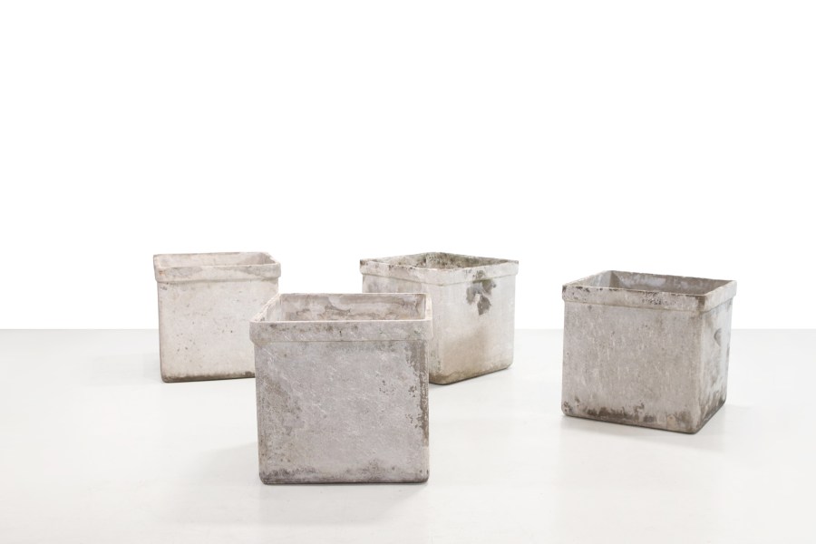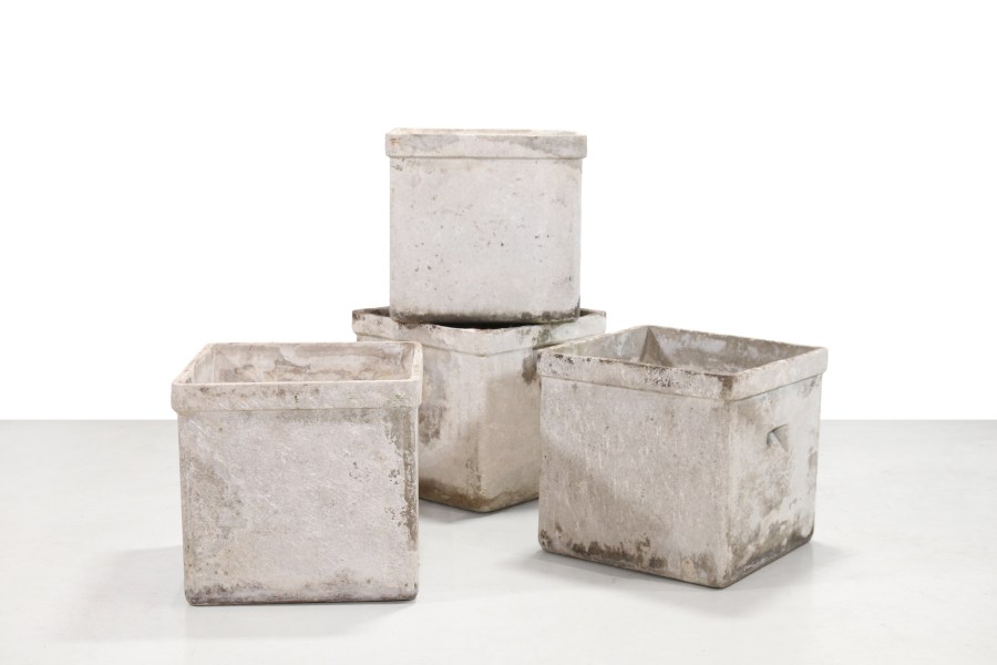 Omschrijving: Set van 4 authentieke vierkante plantenbakken van Willy Guhl voor Eternit. De cement gebonden bakken zijn geschikt voor buitenplanten. Het verfijnde ontwerp en materiaalgebruik is onmiskenbaar dat van Willy Guhl, dit maakt ze super herkenbaar en zeer gewaardeerd. De planters zijn 51 cm breed, 51 cm diep en 51 cm hoog.