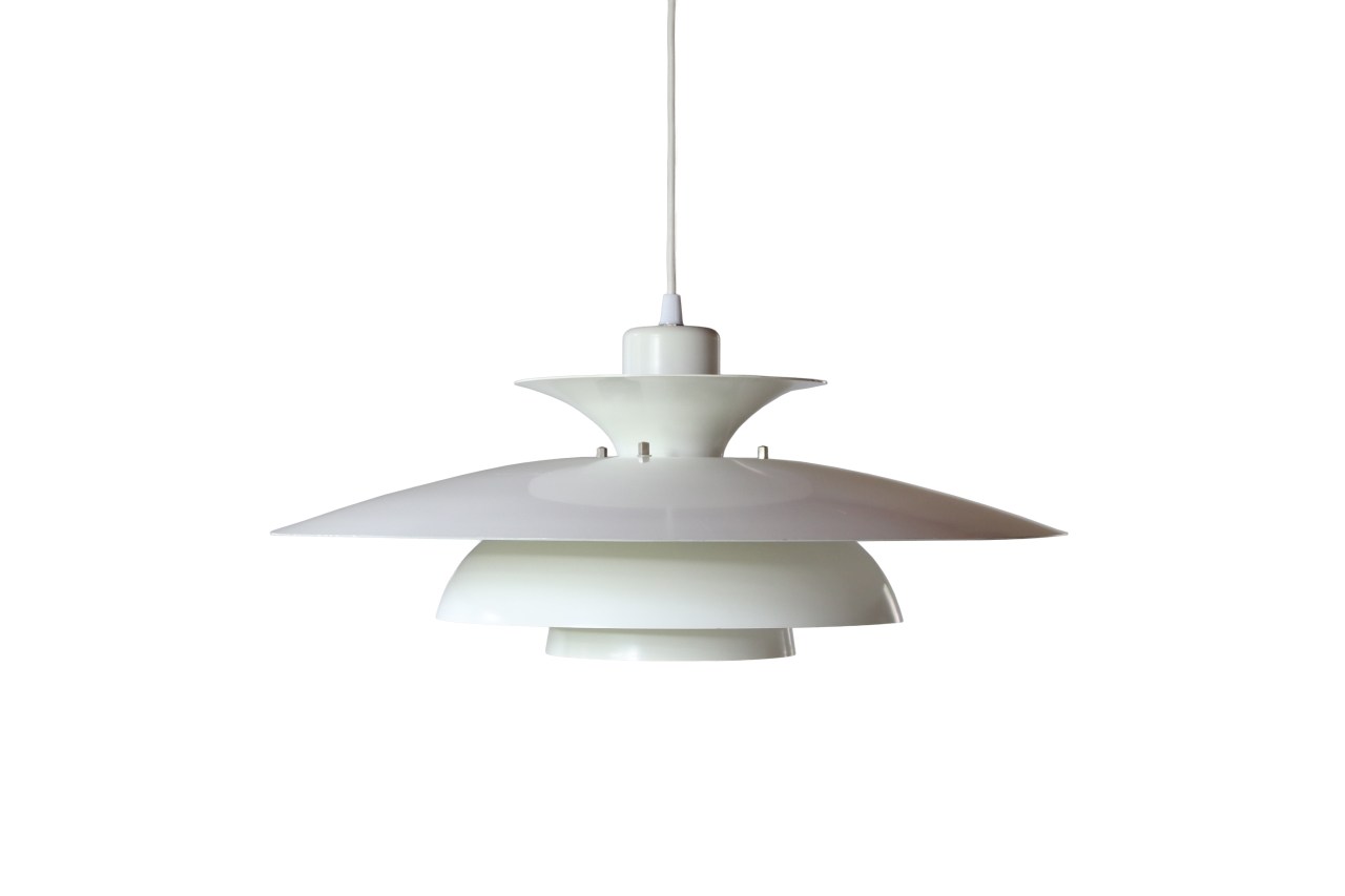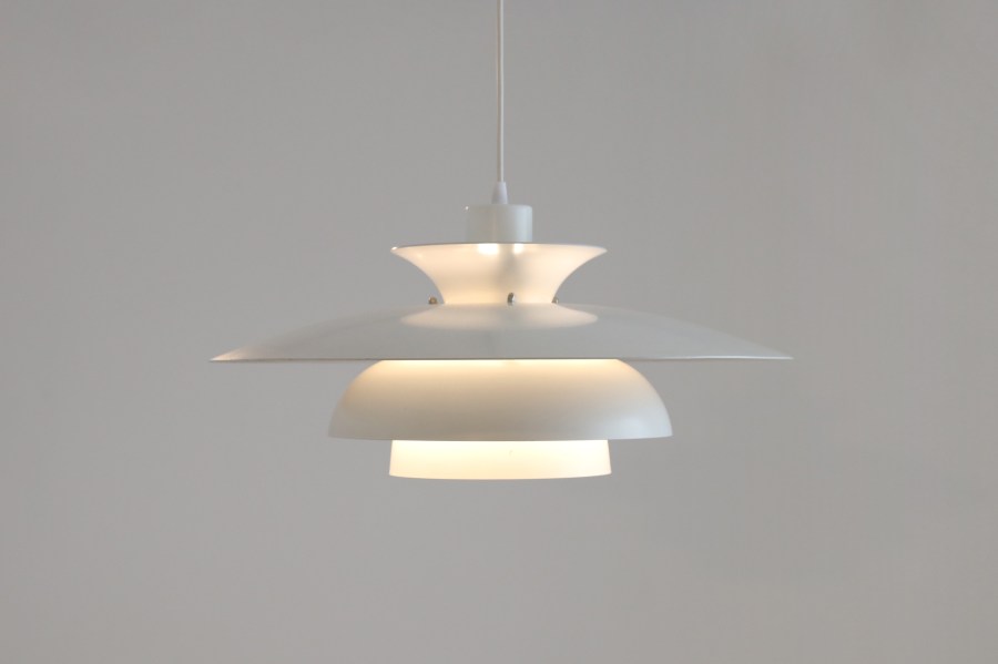 Omschrijving: Witte vintage Deens design hanglamp in de stijl van Poul Henningsen en Louis Poulsen. Dit model het Roma en is gemaakt door het Deense bedrijf Junge Aps in de jaren 70. De lamp heeft vier lagen, is 20cm hoog en heeft een diameter van 50cm.