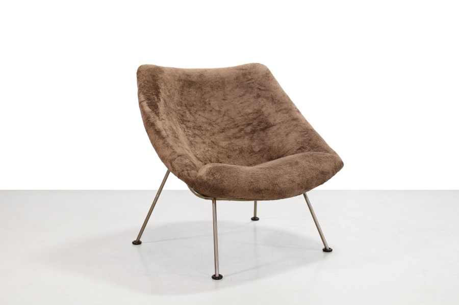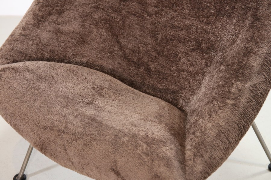 Omschrijving: Prachtige opnieuw gestoffeerde eerste editie F157 fauteuil, ontworpen door Pierre Paulin voor Artifort. Deze stoel is voorzien van nieuw schuim en prachtige Bulu velours meubelstof van Aristide. Dit geeft een sheerling schapenvacht idee, zonder het schuldgevoel met de kwaliteit van hoogwaardige meubelstof. De fauteuil is gestoffeerd op de oude manier, met blinde steek, en staat op een vernikkeld stalen frame. De fauteuil is in totaal 78 cm hoog, heeft een zithoogte van 40 cm en is 84 cm breed.