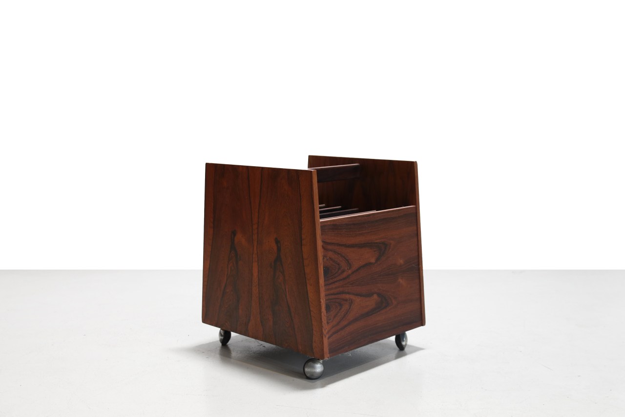 Omschrijving: Prachtige palissander LP trolley van Rolf Hesland voor Bruksbo uit Noorwegen. Dit exclusieve meubel voor het opslaan van Vinyl platen of magazines is gemaakt van het mooist Palissander voor een luxe uitstraling. De LP opslag staat op wielen zodat deze makkelijk te verplaatsen is. De trolley is 35 cm breed, 40,5 cm diep en 43,5 cm hoog.