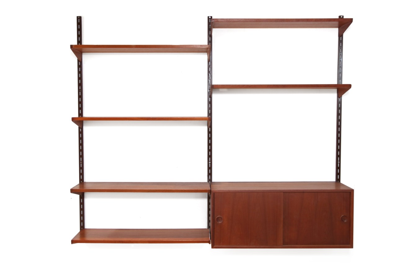 Omschrijving: Teak houten wandsysteem ontworpen door Kai Kristiansen en geproduceerd door Feldballes Mobelfabrik Denmark. Deze wandkast bestaat uit 3 metalen staanders, 6 planken en een kast met 2 schuifdeuren. Het is niet alleen een mooi object in huis, maar ook nog eens heel functioneel. Alleen de staanders aan de muur zijn een vast element. Alle andere onderdelen kunnen naar smaak ingedeeld en opgehangen worden. De totale breedte van de kast zoals afgebeeld op de foto is 170 cm breed en 150 cm hoog. Het wandsysteem is gemerkt met een sticker van de fabrikant.