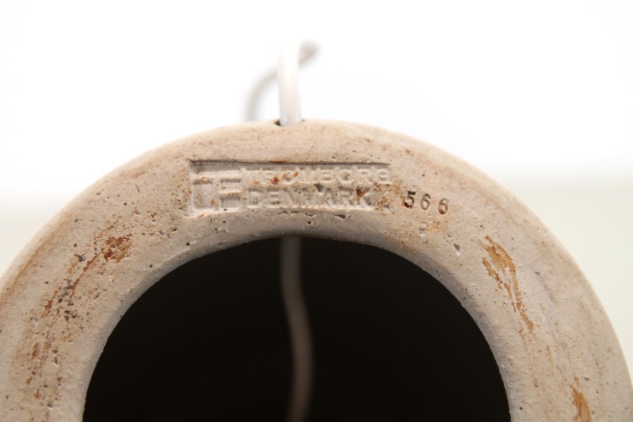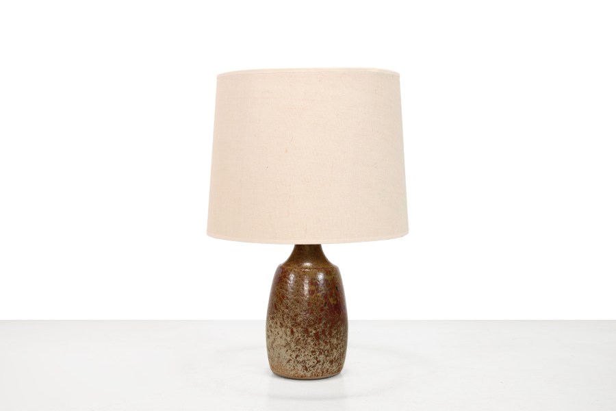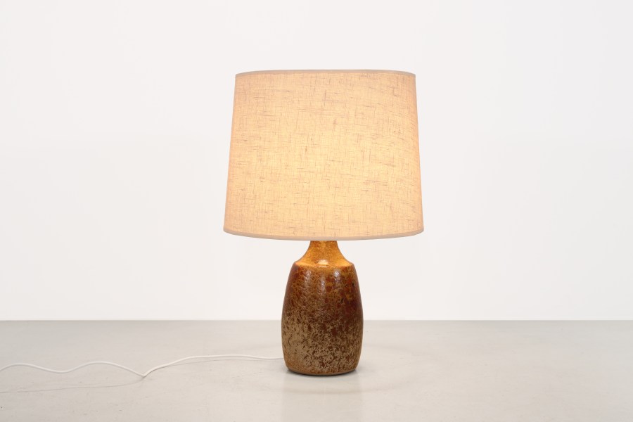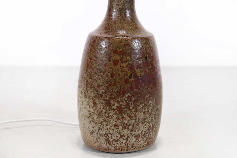 Omschrijving: Prachtige grote keramieken tafellamp van Frank Milo voor Tromborg uit Denemarken. Dit model, 566, is geglazuurd in bruin, groen en koper tinten en heeft een linnen kap. Keramiek van Frank Milo is moeilijk te vinden en erg gewild. Lampen zijn nog zeldzamer en deze gemerkte lamp van dit formaat in perfecte staat is echt een vondst die een mooie plek verdiend. De lamp is inclusief kap 68 cm hoog en heeft een diameter van 45 cm.
