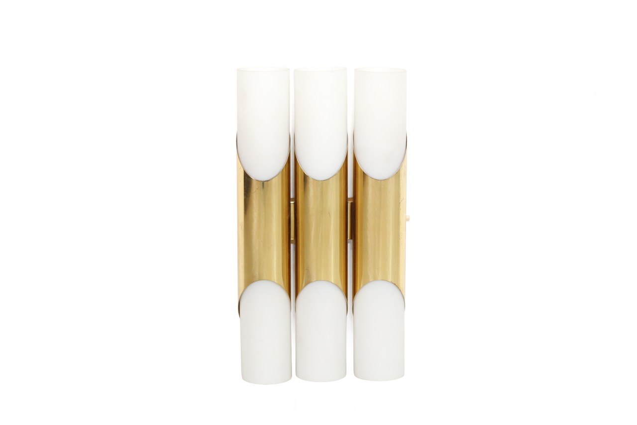 Omschrijving: Prachtige wandlamp ontworpen door Rolf Kruger voor Paul Neuhaus Leuchten in de jaren 70. Deze lamp is gemaakt van messing met zes opaal glazen kelken. De lamp heeft plek voor zes E14 bulbjes en heeft een schakelaar aan de zijkant. De lamp is 35 cm hoog, 19 cm breed en 9 cm diep.
