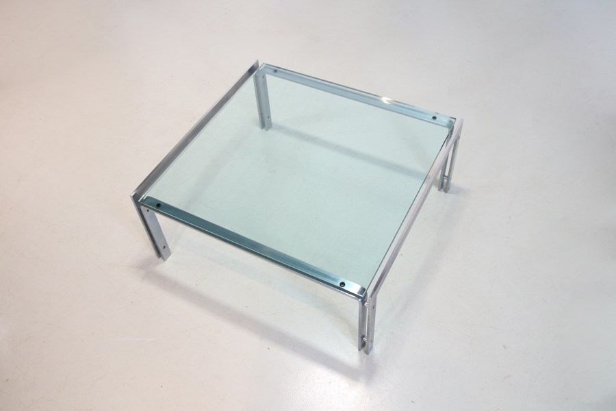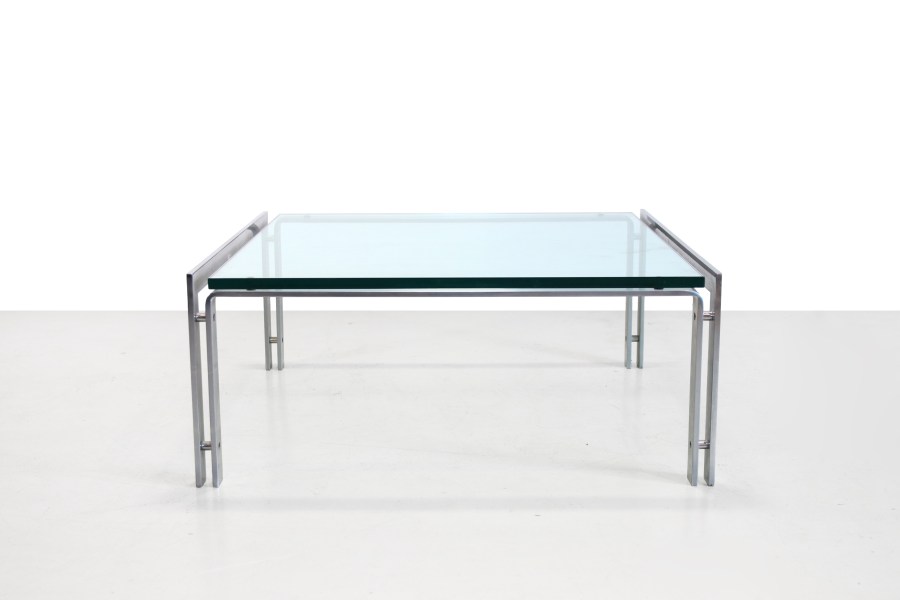 Omschrijving: Minimalistische en moderne glazen salontafel met RVS frame en een dik glazen blad van wel bijna 2 cm dikte. De tafel is in de jaren 80 ontworpen door Hank Kwint en geproduceerd door Metaform, uit Nederland. Het ontwerp van de tafel borduurt voort op de Dutch Modernist ontwerpen van Martin Visser of bijvoorbeeld internationale ontwerpen van Poul Kjaerholm of Florence Knoll, maar speelt in het minimalisme toch door details toe te voegen waarbij de poten kruislings geplaatst zijn en door open ruimtes te laten waardoor onderdelen lijken te zweven. Het glazen blad blijft goed op zijn plek liggen door 4 rubbertjes die tussen het frame en het glas bevestigd zijn. Het mooie aan glazen salontafels is dat ze niet veel ruimte in lijken te nemen doordat je er doorheen kunt kijken. Hierdoor kan je bijvoorbeeld ook nog steeds genieten van je mooie vloer of vloerkleed. De tafel is 110 cm bij 116 cm cm en heeft een hoogte van 36 cm.