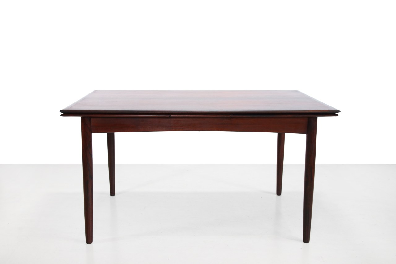 Omschrijving: Vintage Deense uitschuifbare eetkamertafel uitgevoerd in Palissander. De extra bladen zijn mooi geïntegreerd in het ontwerp, opgeborgen onder het blad. De tafelbladen zijn afgewerkt met massief houten randen. Dit heeft er onder andere voor gezorgd dat de tafel nog in zo’n goede staat is. De tafel kan mooi gecombineerd worden met de Palissander stoelen die we op dit moment ook te koop aanbieden. Deze eetkamertafel is 140 cm lang, 90 cm diep en 74 cm hoog. Elk extra blad is 55 cm in lengte. Totaal uitgeschoven is deze tafel dan ook 250 cm lang.