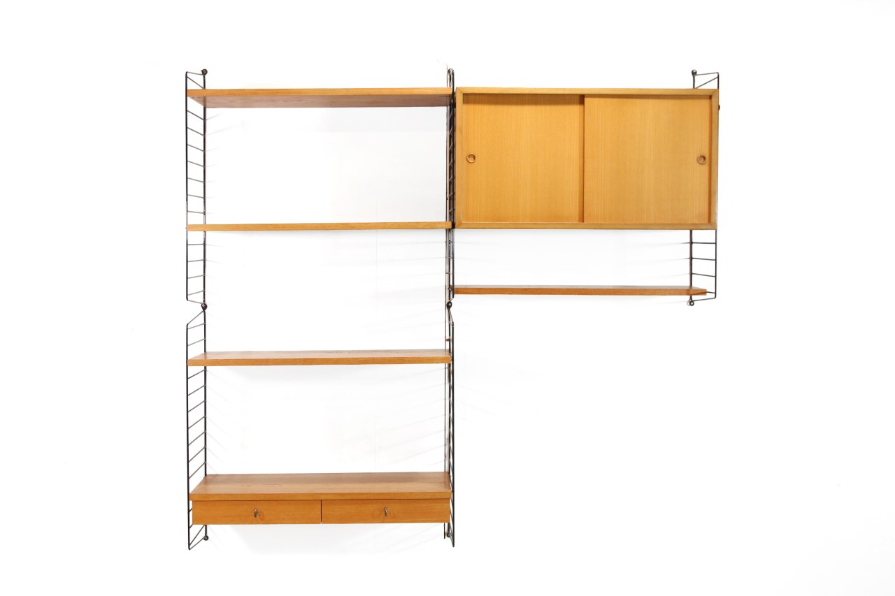 Omschrijving: Mooi String wand systeem ontworpen door Nisse Strinning. Wat ooit zijn afstudeerproject was, is nu een gewild item in een modern interieur. Deze zeldzamere uitvoering in essenhout bestaat uit drie planken van 80 cm breed en 30 cm diep, een plank van 20 cm diep en het kastje het ladeblok zijn beide ook 80 cm breed en 30 cm diep. Door het ladeblokje kan dit wandsysteem ook zeer goed als bureau gebruikt worden. De kast is volledig modulair en dus ook naar eigen wens in te delen en op te hangen. Er kan ook gekozen worden om alle staanders volledig in de breedte op te hangen. In dat geval krijg je een kast van vier rijen breed.