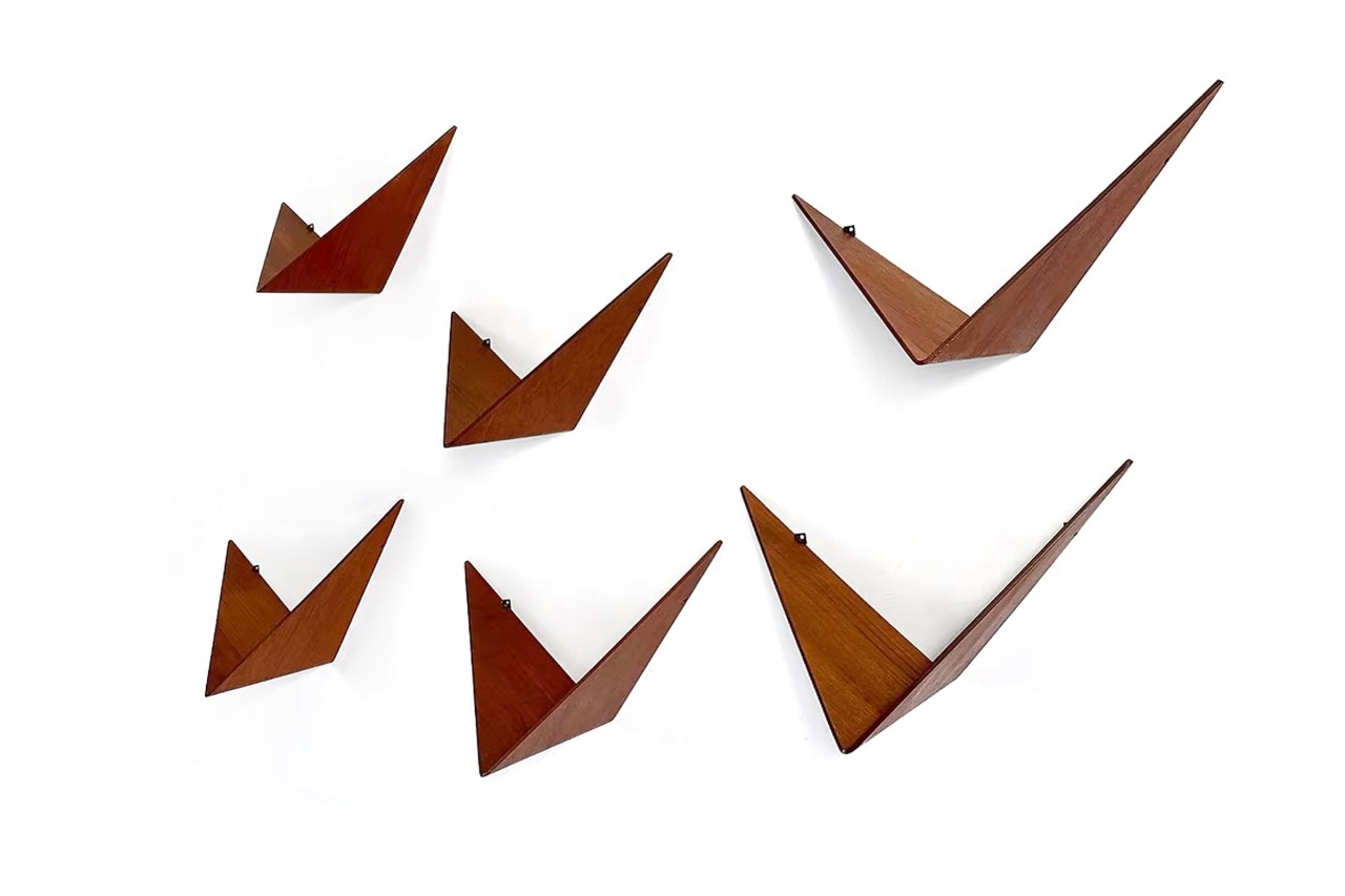 Iconische set van zes Butterfly wandplanken, ontworpen door Poul Cadovius. Deze planken zijn uitgevoerd in teak plywood en kenmerken zich door hun elegante, licht gebogen vorm welke lijken op vogels of vlinders. Dit is ook de reden dat deze planken de Butterfly’s worden genoemd. Het ontwerp is zowel functioneel als sculpturaal en laat perfect zien waarom Cadovius tot de grote namen van het Deense modernisme behoort. De Butterfly planken zijn ontworpen voor het tentoonstellen van boeken, keramiek of kunstobjecten. Maar ook zonder iets op de plank, is het een kunstwerk an sich. Een zeldzame complete set, geliefd bij liefhebbers en verzamelaars van Scandinavisch design.