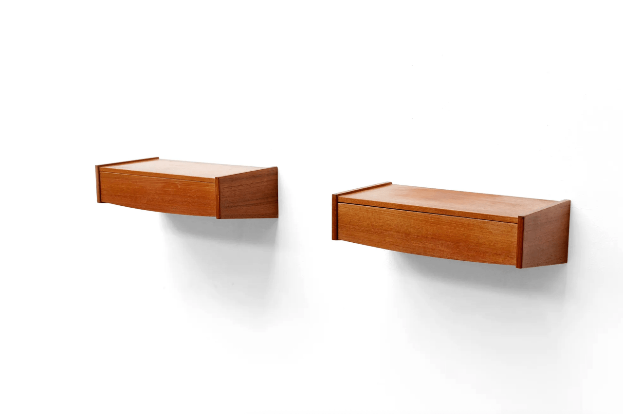 Omschrijving: Zeer prachtige zwevende nachtkastje uit Denemarken gemaakt van teak. De kastjes worden blind bevestigd aan de muur en hebben beiden één lade. Door het simpele design passen deze kastje goed in elke slaapkamer. De nachtkastjes zijn 40 cm breed, 20,5 cm diep en 12 cm hoog per kastje.