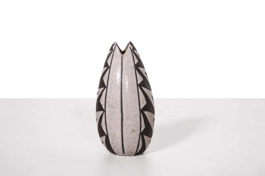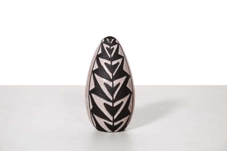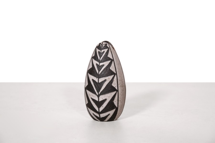 Omschrijving: Deze prachtige zeldzame vaas is ontworpen door Marianne Starck en geproduceerd door de fabrikant Michael Andersen and Son uit Bornholm, ook wel bekend als Bornholms ceramic. Deze vaas bestaande uit donker keramiek en wit glazuur met een prachtig tribale motief, is onderdeel van de veelbesproken Negro series. Deze lijn die Marianne heeft ontworpen is een eerbetoon aan Afrikaanse kunst. Gezien de negatieve associatie met de oorspronkelijke naam van deze serie, wordt het vandaag de dag de Tribal serie genoemd. Deze vaas is 14,5 cm hoog en heeft een diameter van 8 cm.