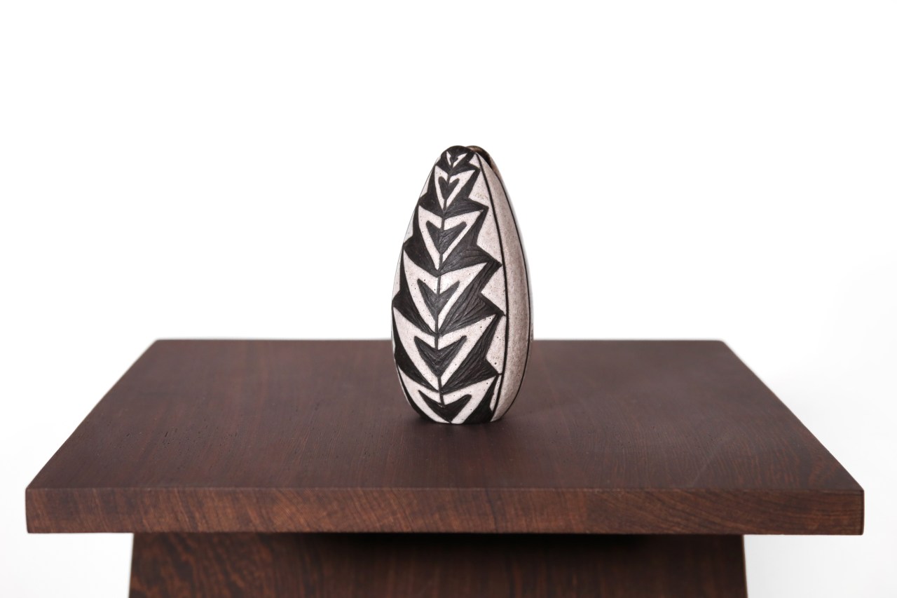 Omschrijving: Deze prachtige zeldzame vaas is ontworpen door Marianne Starck en geproduceerd door de fabrikant Michael Andersen and Son uit Bornholm, ook wel bekend als Bornholms ceramic. Deze vaas bestaande uit donker keramiek en wit glazuur met een prachtig tribale motief, is onderdeel van de veelbesproken Negro series. Deze lijn die Marianne heeft ontworpen is een eerbetoon aan Afrikaanse kunst. Gezien de negatieve associatie met de oorspronkelijke naam van deze serie, wordt het vandaag de dag de Tribal serie genoemd. Deze vaas is 14,5 cm hoog en heeft een diameter van 8 cm.