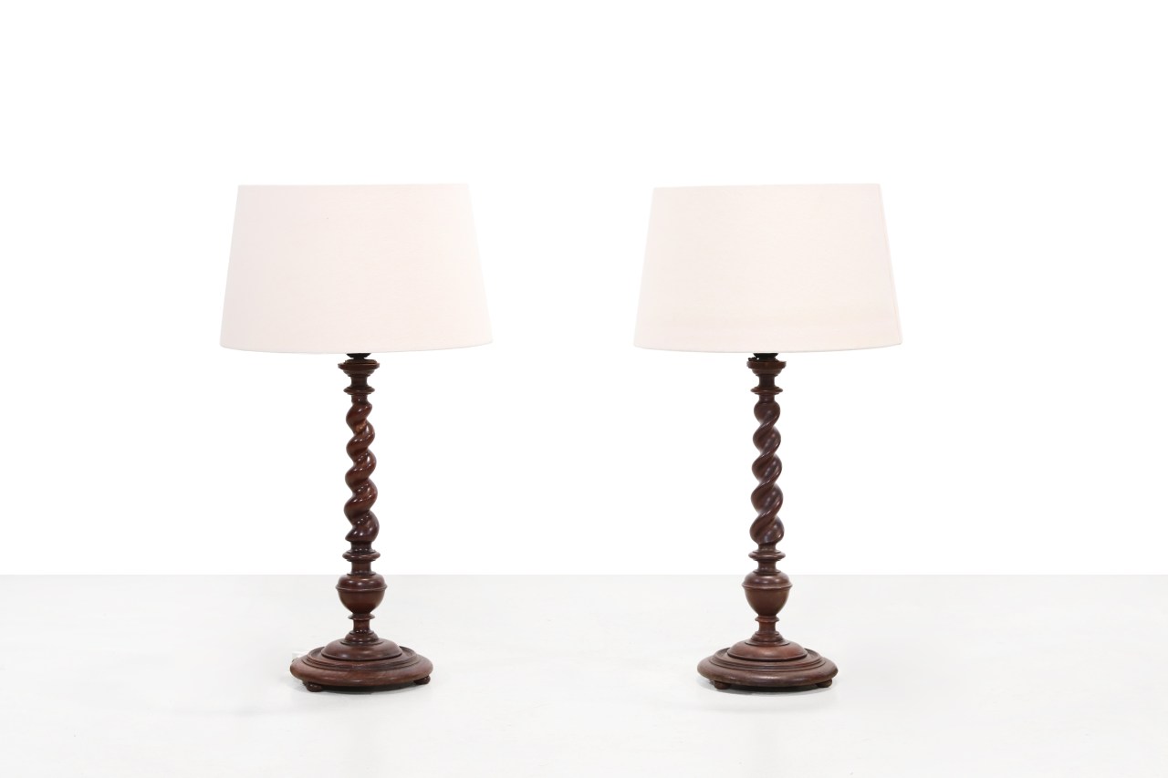 Engelse barley twist gedraaide houten tafellampen Date: 1 februari 2026Author: VAN ONS Categorie: Lighting, NEW ARRIVALS, Te koop Tags: Antiek, barley, tafellamp, turned, twist Berichtnavigatie ← Marianne Starck tribal vase door Michael Andersen, Bornholm Denmark Aantal: 2 lampenLand: EngelandJaar: 1950sArtikelnummer: L5097 Staat: Goede vintage staat. Prijs: € 900,- voor de set.