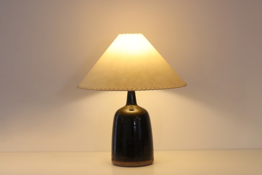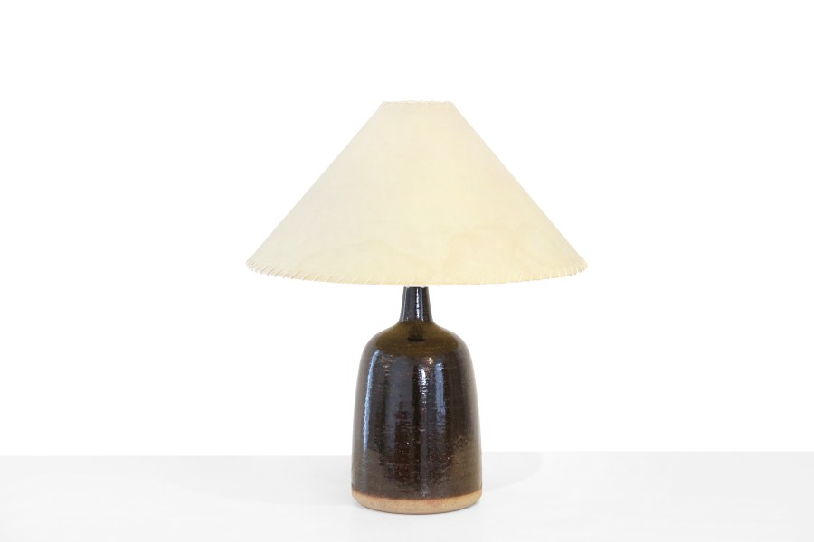 Omschrijving: Prachtige keramieken tafellamp ontworpen door Per Linnemann Schmidt voor Palshus. De Deense beeldhouwer en keramist heeft in de jaren 30 aan de Koninklijke Academie van Beeldende Kunsten in Kopenhagen gestudeerd. In 1949 richtte hij samen met zijn vrouw Annelise Linnemann-Schmidt; Palshus Stentøj op in Sengeløse, net buiten Kopenhagen. De naam Palshus is een combinatie van hun beide namen met de toevoeging van het Deense woord voor huis, Hus. Zij hebben tot 1972 servies, vazen en lampen gemaakt in Scandinavische aardetinten. Deze lamp met modelnaam DL-49 heeft een voet met een donkerbruine glazuur met groene spikkeltjes. De tafellamp heeft een hoogte van 50 cm en de kap heeft een diameter van 41 cm.