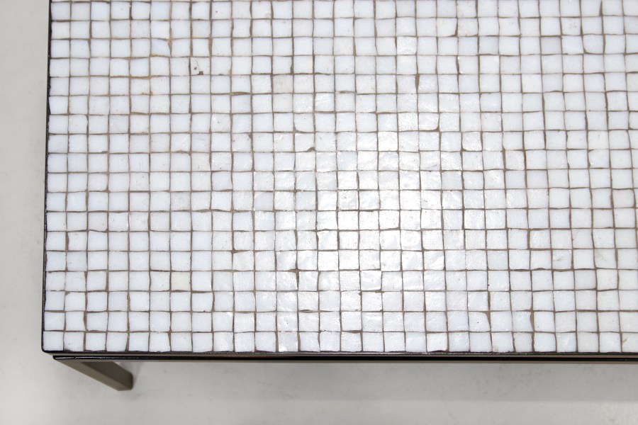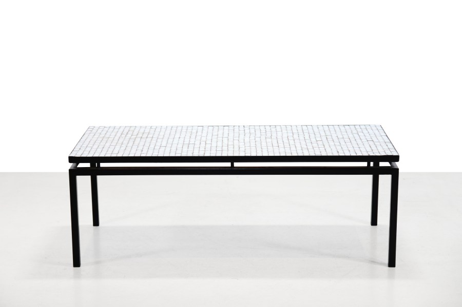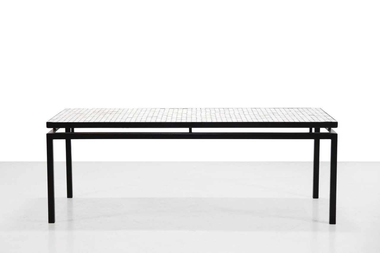 Omschrijving: Elegante salontafel met slank zwart metalen onderstel en een karakteristiek zwevend tafelblad, ingelegd met een fijn mozaïek van keramische tegeltjes. Het blad lijkt los te komen van het frame, wat de tafel een lichte en architectonische uitstraling geeft. Het ontwerp vertoont duidelijke overeenkomsten met tafels die worden toegeschreven aan Floris Fiedeldij voor Artimeta: functioneel modernisme, gecombineerd met een subtiel decoratief accent. De strakke belijning van het metaal vormt een mooi contrast met het ritme en de tactiliteit van het mozaïek. Een stijlvol en tijdloos object dat zich moeiteloos laat combineren. De tafel is 119 cm breed, 51 cm diep en 42,5 cm hoog.