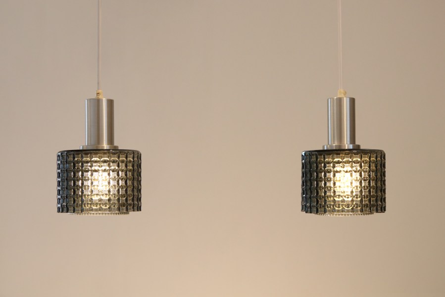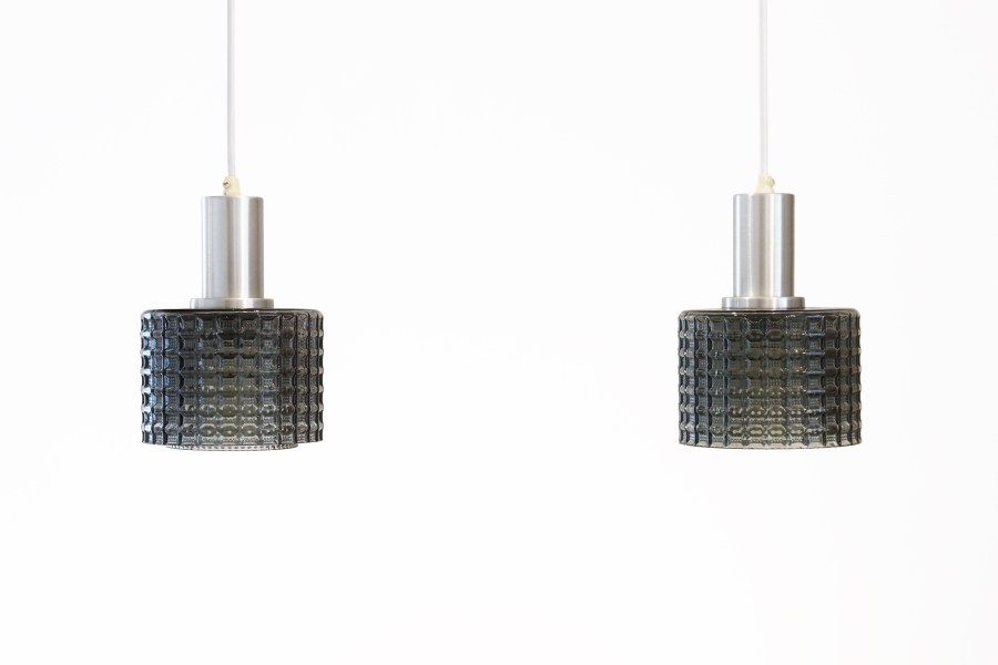 Omschrijving: Bijzondere set glazen hanglampen ontworpen door Carl Fagerlund voor Orrefors uit Zweden. De lampen hebben een prachtige rijk versierde ronde kelken in donker gekleurd glas, met daarbinnen een cilindrische kristalglazen diffuser. De lampen hebben roestvrij stalen details. Kortom prachtige en zeldzame set lampen die een mooi plekje verdienen. De lampen zijn 20 cm hoog en hebben een doorsnede van 15 cm.
