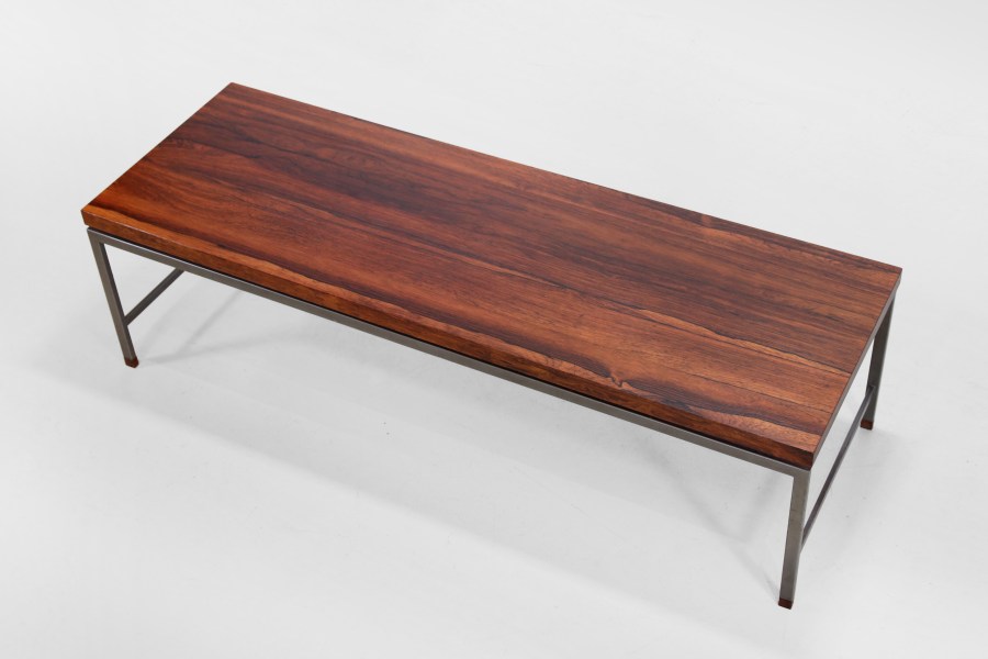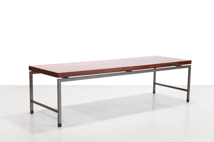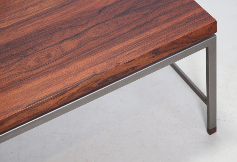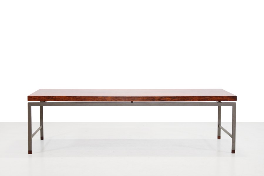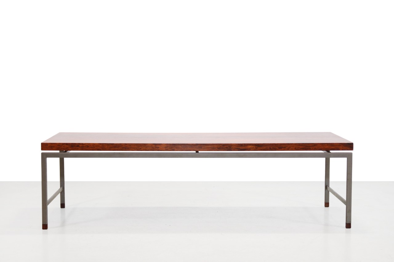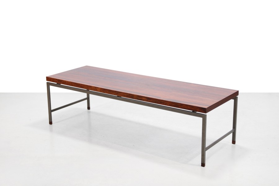 Omschrijving: Typische Nederlandse modernistisch vormgegeven salontafel uit de jaren 60, waarbij gebruik is gemaakt van een slank grijs metalen frame met het warme Palissanderhout als mooi contrast. Het blad is uitgevoerd in palissanderfineer met een mooie uitgesproken nerf, waarbij de strakke metalen constructie subtiel wordt geaccentueerd door massief palissanderhouten dopjes. De tafel is typerend voor het ingetogen modernisme van die periode: helder van vorm, tijdloos in uitstraling en gemaakt om generaties mee te gaan. De tafel is 150 cm lang, 50 cm diep en 42 cm hoog.