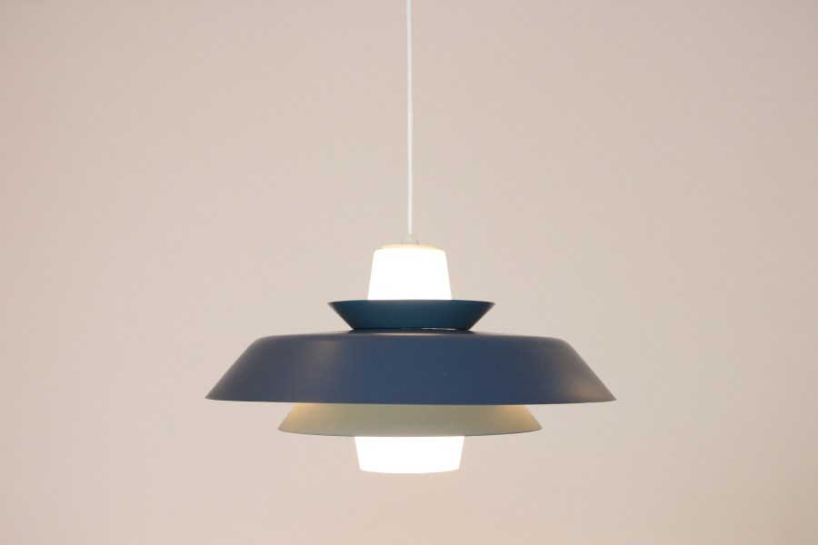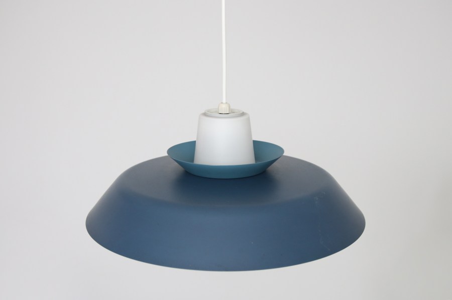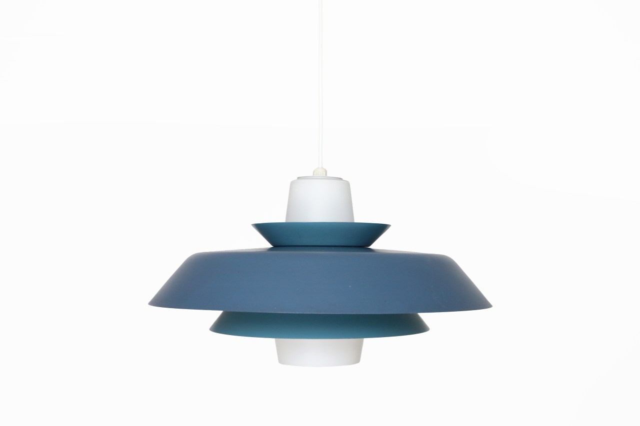 Omschrijving: Erg mooie vintage Deens design hanglamp van Deense fabrikant Vos Belysning. De lamp heeft een opaalglazen kelk waarop blauwe ringen rusten. Een mooie combinatie van twee materialen, waarbij de lamp mooi egaal licht verspreidt. De lamp heeft een hoogte van ongeveer 23 cm en een diameter van 38 cm.