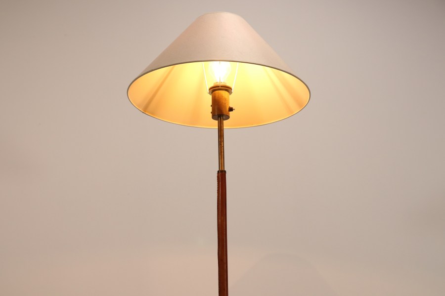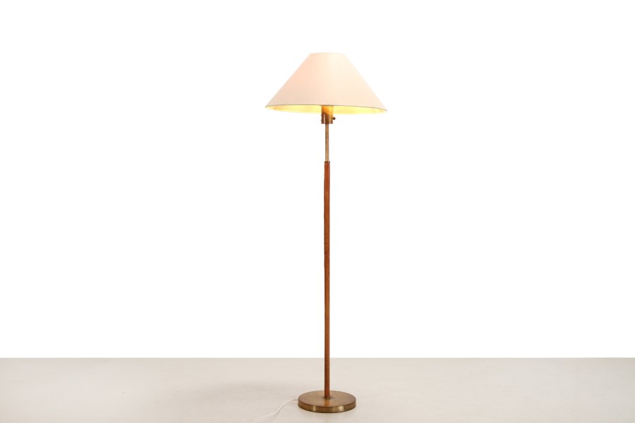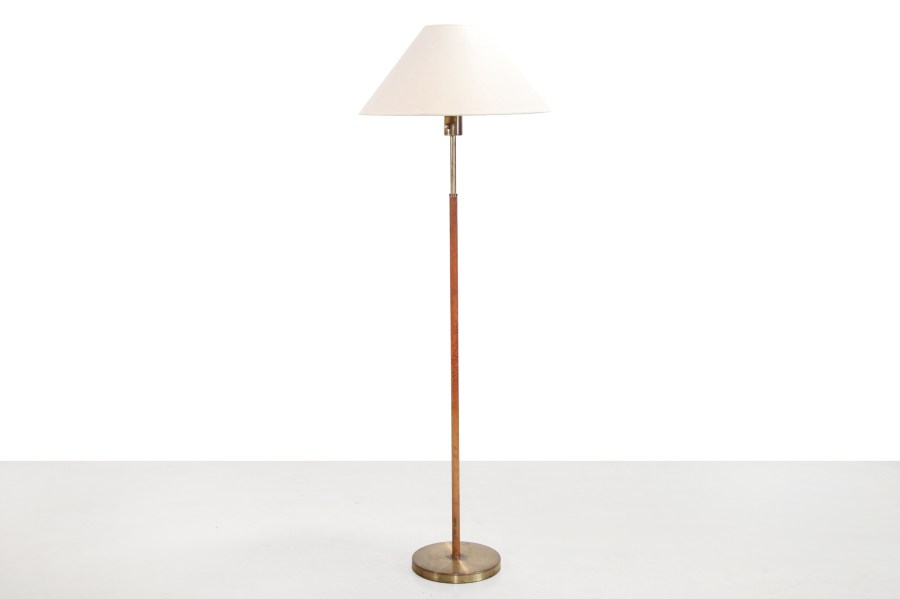 Omschrijving: Deze elegante vloerlamp ademt de verfijnde eenvoud van Scandinavisch design uit de jaren vijftig. De slanke staander is uitgevoerd in messing en deels met leer overtrokken, wat het ontwerp een warme en karaktervolle uitstraling geeft. De linnen kap zorgt voor een zacht en diffuus licht dat de ruimte op een rustige manier vult. De vormtaal en materiaalkeuze doen denken aan de iconische ontwerpen van Paavo Tynell, zonder een exacte toeschrijving. Een tijdloos object dat moeiteloos past in zowel een modern als een klassiek interieur. De lamp is 150 cm hoog en de kap heeft op z’n breedst gemeten een diameter van 50 cm.