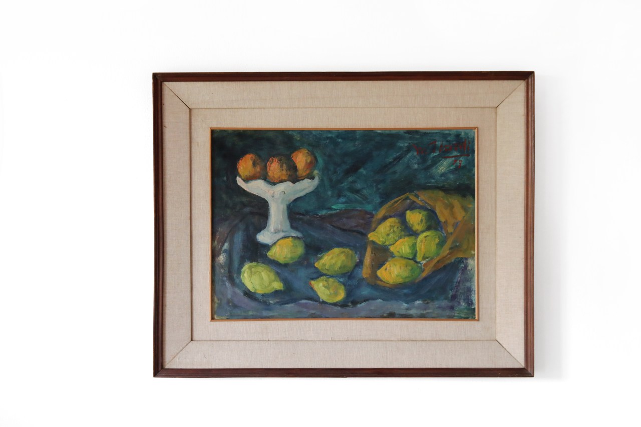 Omschrijving: Olieverf op doek, gesigneerd en gedateerd 1957. Sfeervol Italiaans stilleven van de hand van Mariano Ilardi, geschilderd in 1957. De compositie toont citroenen en sinaasappels op een verhoogde schaal, uitgevoerd in rijke, expressieve penseelstreken. Het diepe blauw van de achtergrond contrasteert prachtig met de warme geel- en groentinten van het fruit, wat het werk een levendige maar ingetogen uitstraling geeft.