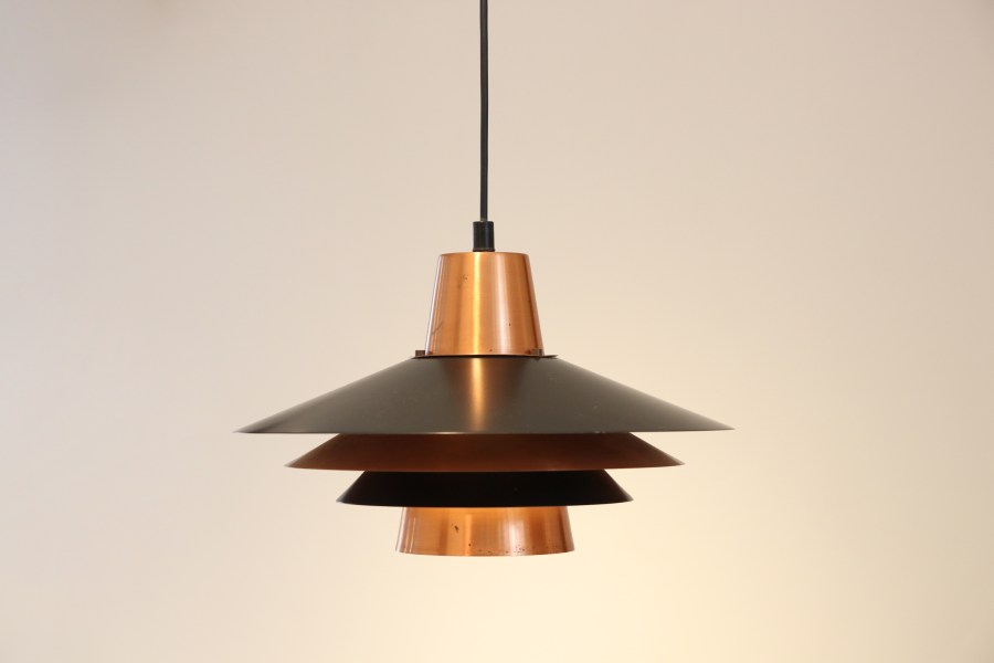 Omschrijving: Prachtige Deens design lamp in de stijl van Louis Poulsen en Fog and Morup. De stijlvolle hanglamp heeft koperen en zwart gelakte schalen en geeft door het materiaalgebruik een warme gloed. De lamp is 30 cm hoog en heeft een diameter van 38 cm.