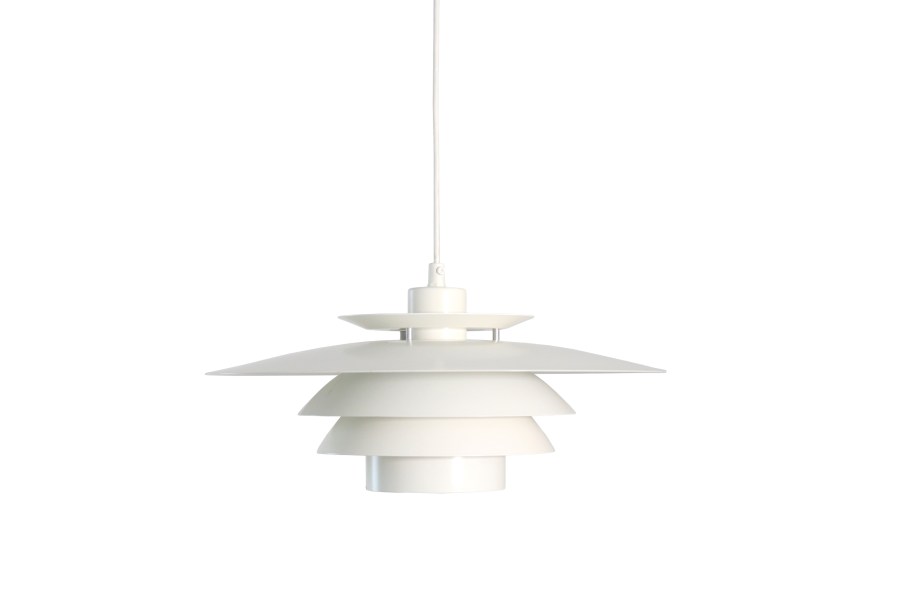Omschrijving: Witte vintage Deens design hanglamp in de stijl van Poul Henningsen. Deze lamp is van fabrikant Form-light en komt uit de jaren 70. Dit model heeft vier lagen, is 20 cm hoog en heeft een diameter van 43 cm.