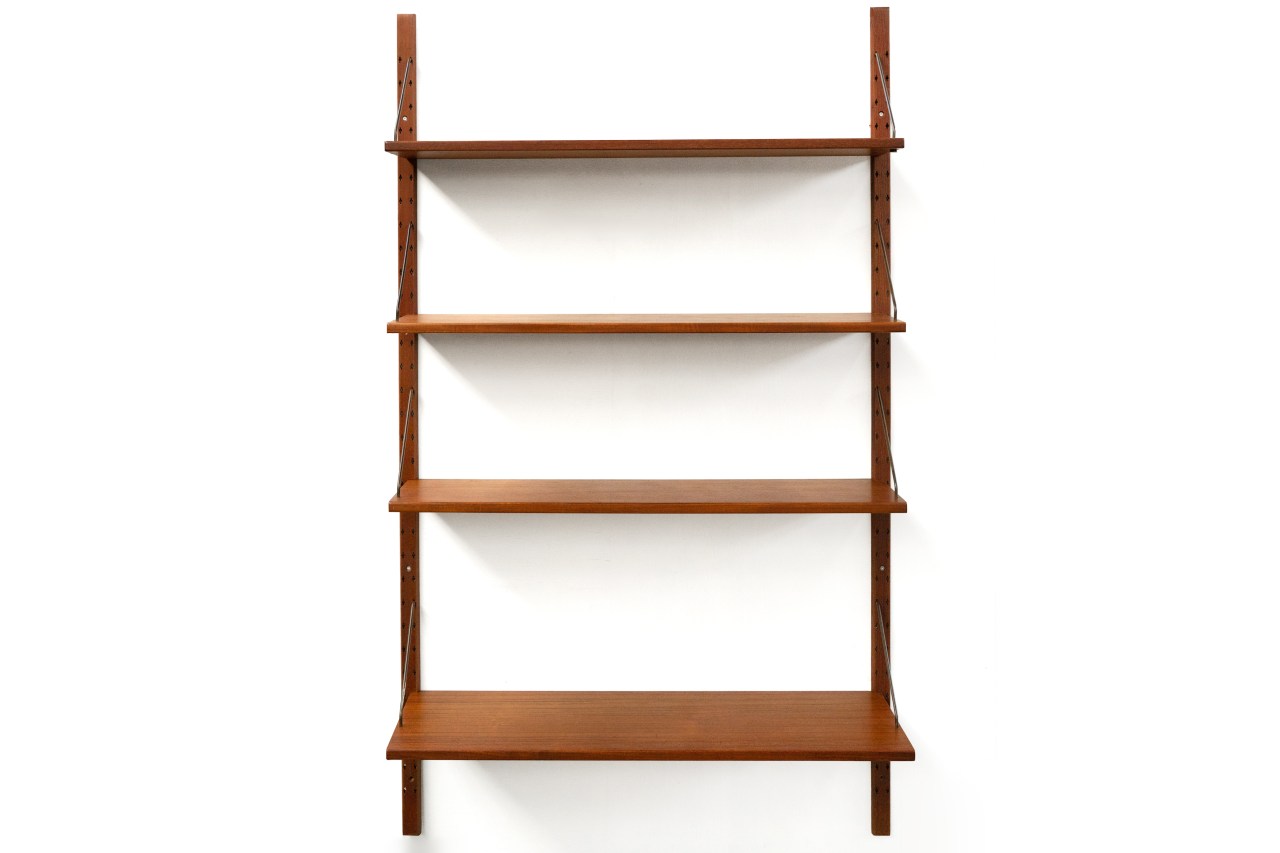 Omschrijving: Teakhouten wandsysteem van Deense afkomst. De planken zijn extra breed en hebben een breedte van 100 cm. Met messing stangen kunnen ze op elke gewenste hoogte in de latten worden gehangen. In totaal bestaat dit systeem uit drie planken van 25 cm diepte en een plank van 31 cm diep. Inclusief de staanders is het wandsysteem 104 cm breed en 175 cm hoog.