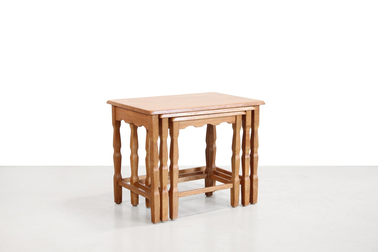 Omschrijving: Mooie set van drie in elkaar schuifbare eikenhouten tafels, gemaakt in de jaren 60 door de Deense ontwerper Henning Kjærnulf. De set is gemaakt van massief eikenhout en heeft prachtige details, zoals de bewerkte randen en pootjes. De tafels zijn daardoor niet alleen functioneel maar ook erg decoratief.