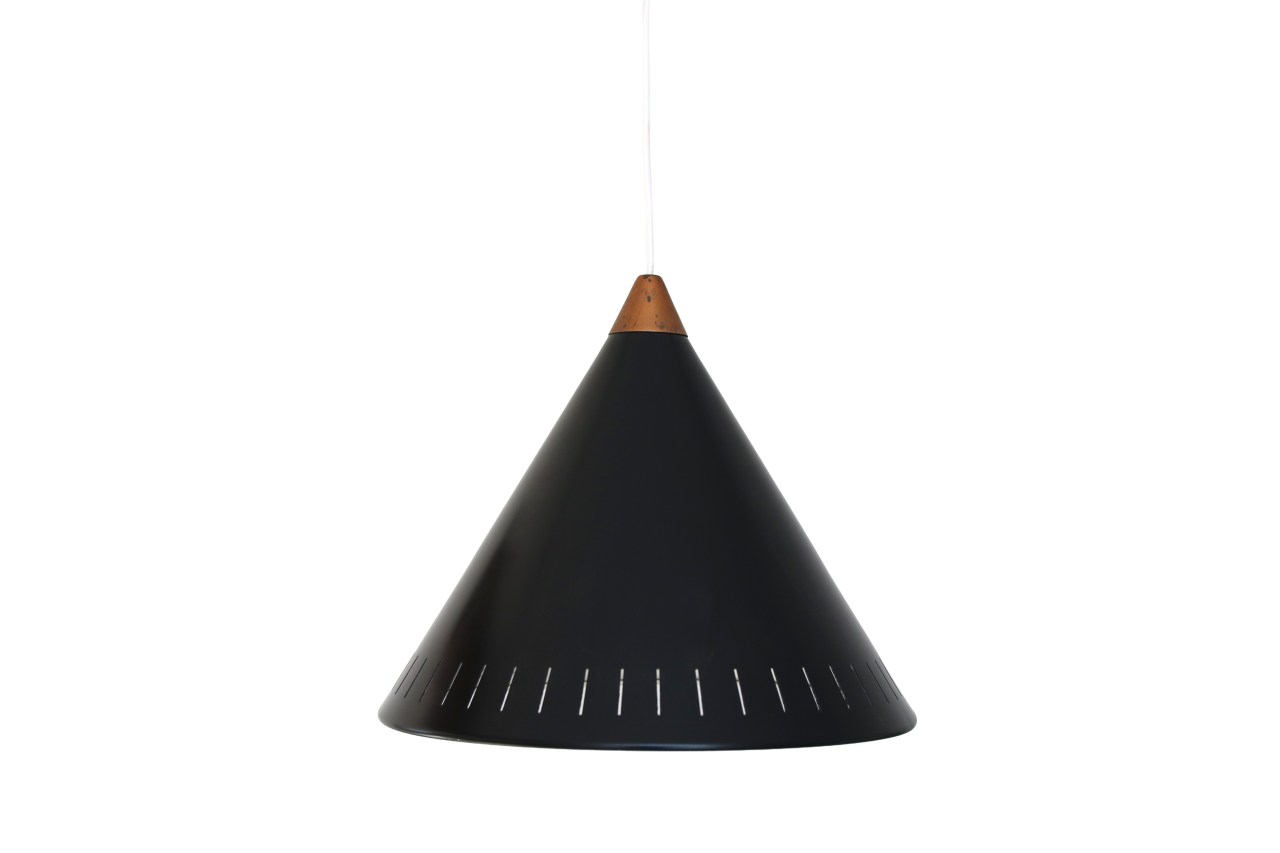Omschrijving: Mooie Deens design kegel lamp van Bent Karlby voor LYFA. De lamp is gemaakt van een zwart gelakte geperforeerde aluminium kap met een koperen detail.