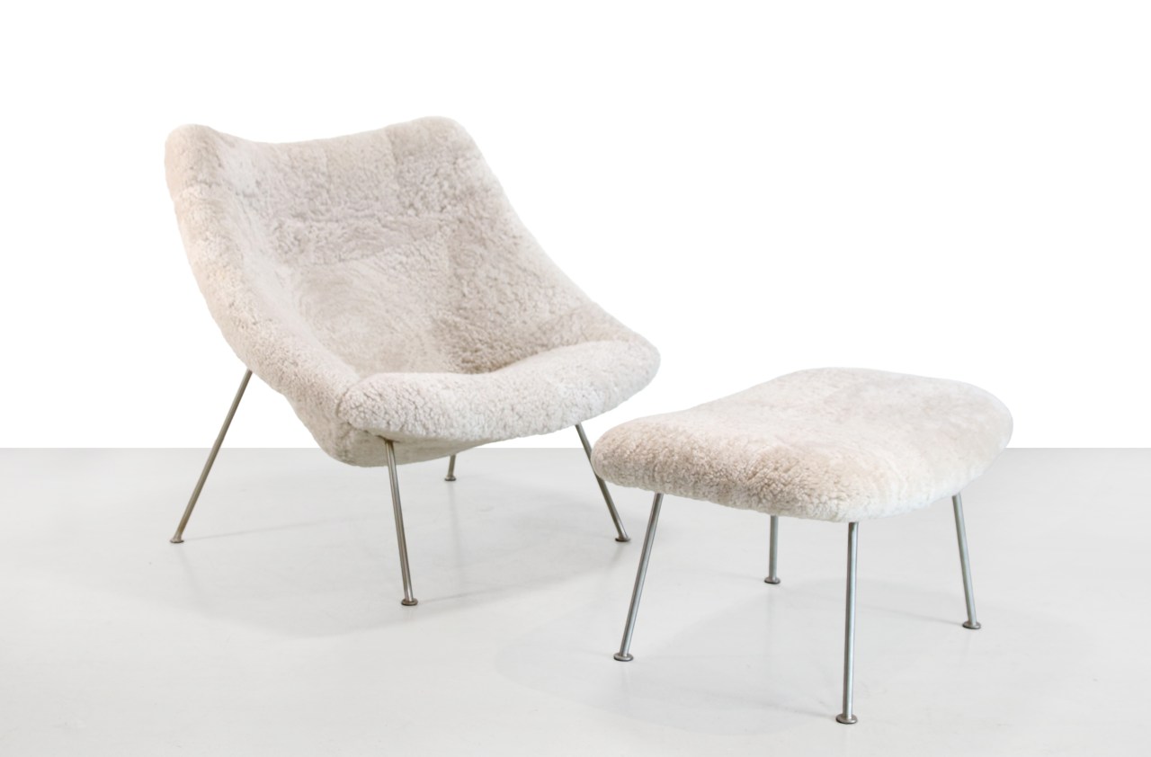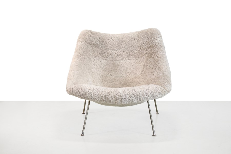 Omschrijving: Prachtige opnieuw gestoffeerde F157 fauteuil met ottoman, ontworpen door Pierre Paulin voor Artifort. Deze Oyster stoel en hocker zijn voorzien van nieuw schuim en gestoffeerd met schapenwollen vachtjes uit Nieuw Zeeland. Het gaat om een echt oud setje, te zien aan het vernikkeld stalen frame. Deze unieke combinatie van een grote Oyster met zijn zachte schapenvacht, maakt deze stoel een geweldige comfortabele lounge fauteuil om in weg te kruipen. De fauteuil is 83 cm hoog, 89 cm breed en 80 cm diep, met een zithoogte van ongeveer 40 cm. De bijbehorende ottoman is 37,5cm hoog, 69cm breed en 46,5cm diep.