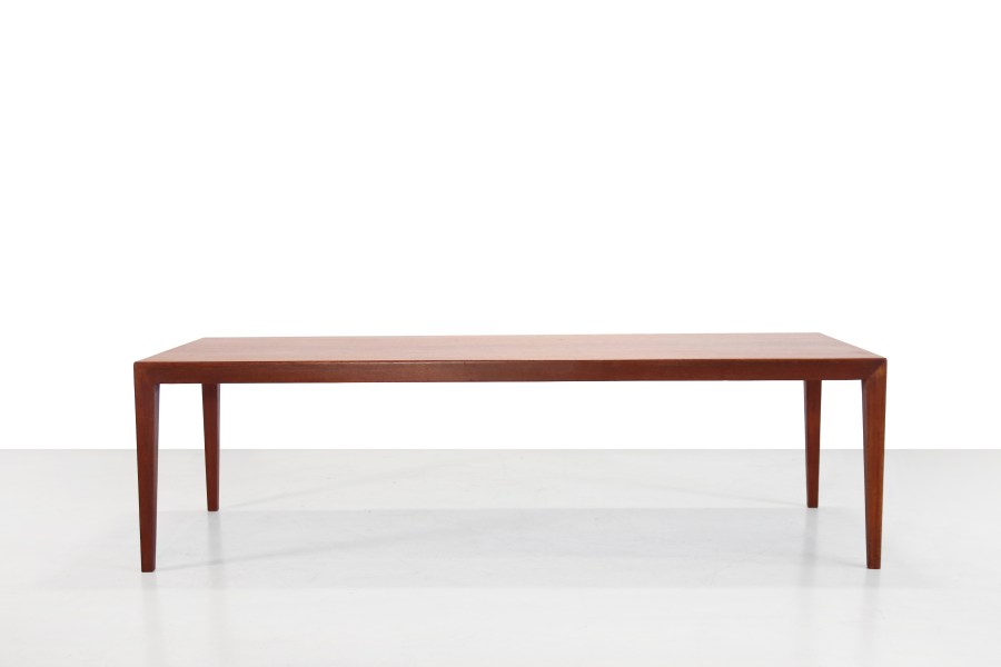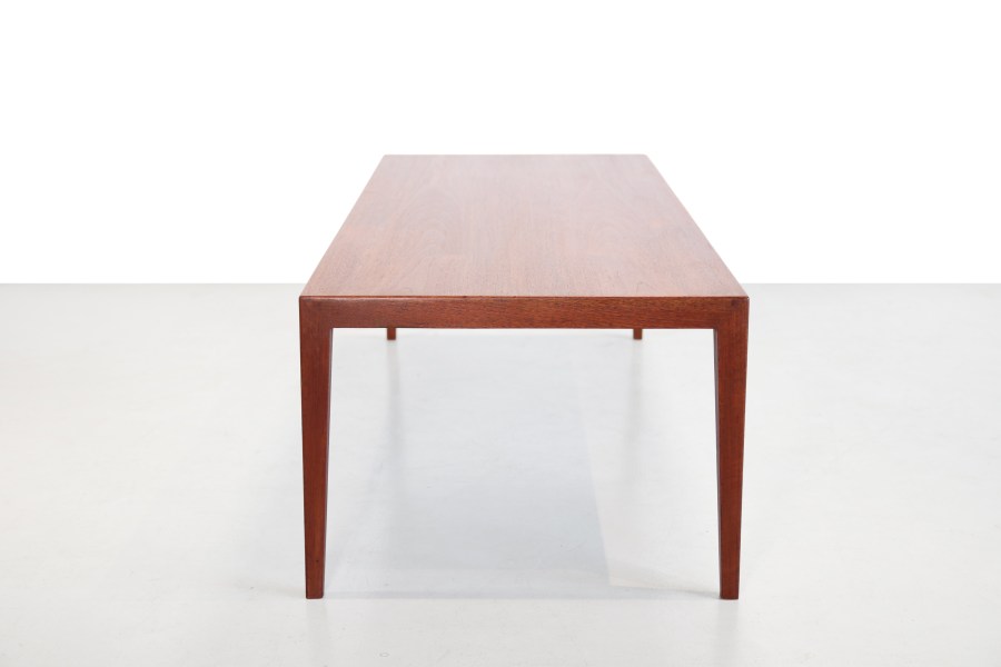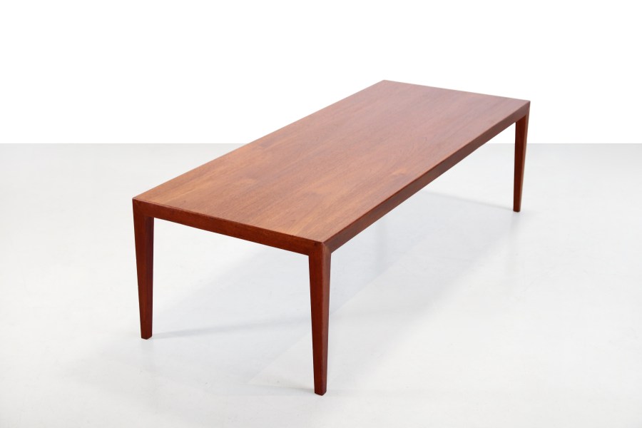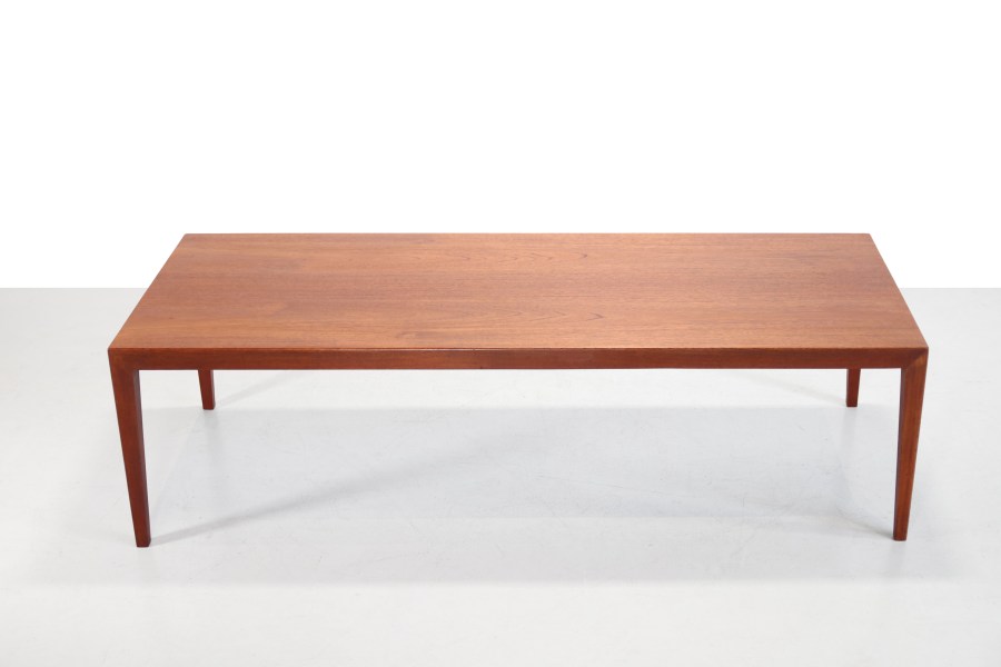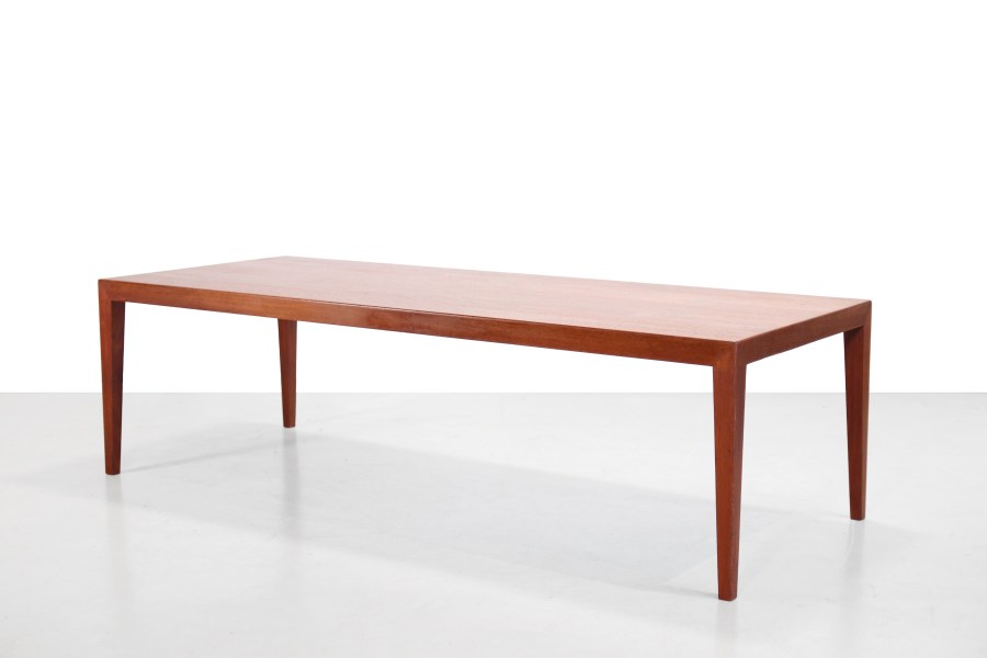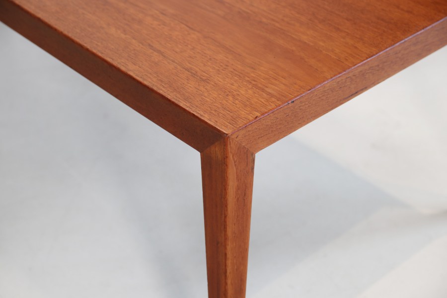 Omschrijving: Teakhouten Deens design salontafel ontworpen door Severin Hansen voor Haslev Mobelfabrik. Goede Deense kwaliteit en prachtig Scandinavisch modern design. De tafel is gemaakt van een combinatie van teak fineer en massief teakhout en heeft prachtige minimalistische details die de tafel bijzonder maken. Kijk bijvoorbeeld maar eens naar de verbinding van de pootjes aan het tafelblad. Deze coffeetable is zeer geschikt als tafel voor bij de bank, maar kan ook goed gebruik worden als end table achter je bed, of als tvmeubel. De tafel is 127 cm breed, 51 cm diep en 40 cm hoog.