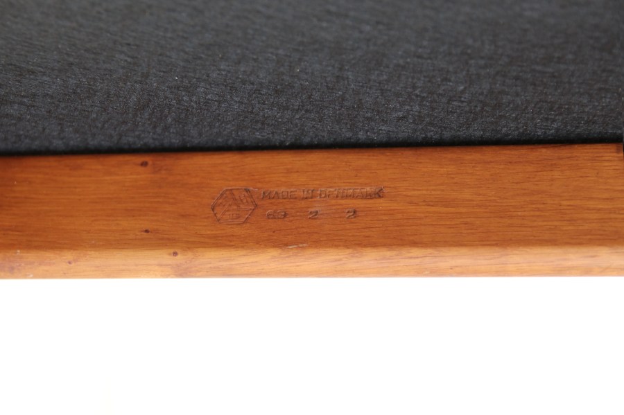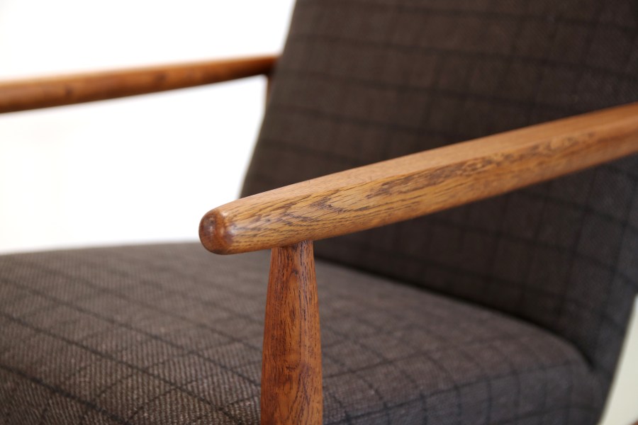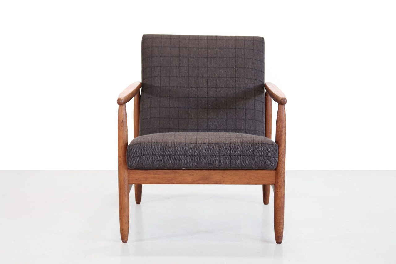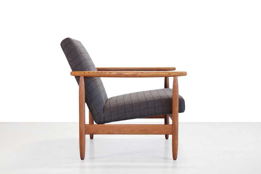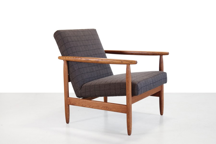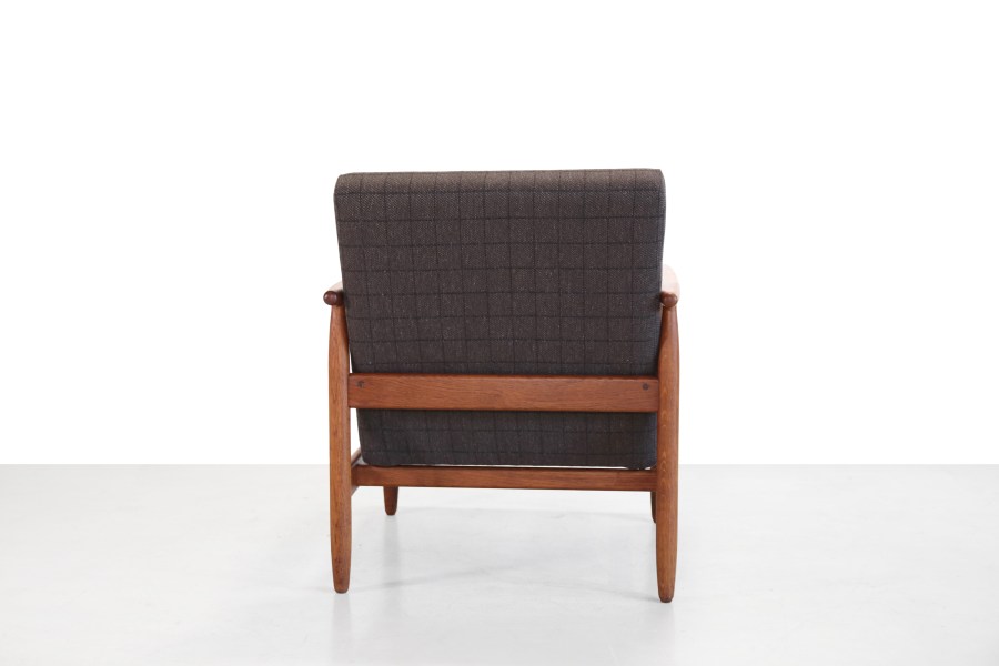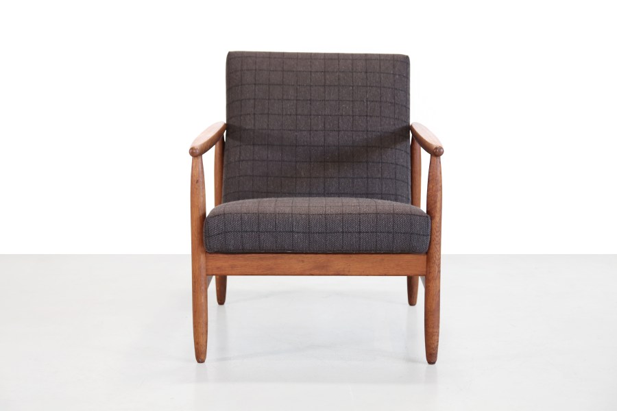 Omschrijving: Mooie zeldzame fauteuil ontworpen door Ejvind Johansson en geproduceerd door Feldballes Mobelfabrik in Denemarken. De stoel is gemerkt met een stempel van de fabrikant en de datum 2 februari 1963. Architect en ontwerper Ejvind A. Johansson volgde Borge Mogensen op als hoofddesigner in de FDB design studio. Deze fauteuil springt in het oog door zijn prachtige eenvoudige rechte vormgeving en het hoge zitcomfort. Het frame is gemaakt van massief eikenhout en de zitting en rugleuning zijn opnieuw gestoffeerd met een vergelijkbare wollen geruite stof welke origineel op de fauteuil zat. Deze fauteuil is 78 cm hoog, 65 cm breed en 80 cm diep.