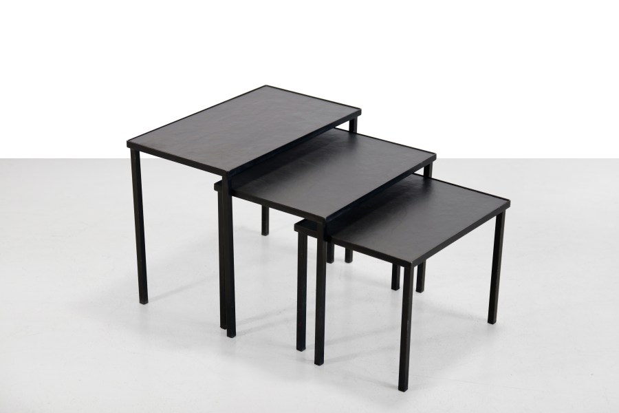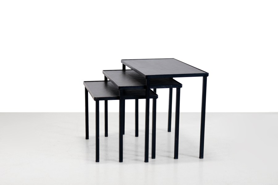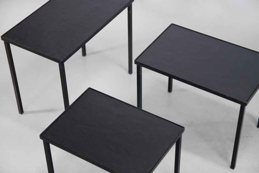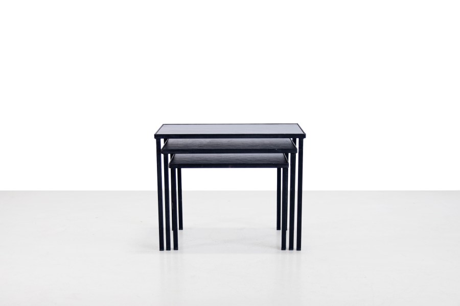 Omschrijving: Mooie ranke Mid Century modern mimiset van zwart metaal met leisteen bladen. Deze set is van de Nederlandse ontwerper Floris Fiedeldij voor de fabrikant Artimeta. Deze stijlvolle nesting tables zijn multifunctioneel en passen perfect in een modern design interieur. De tafeltjes kunnen handig onder elkaar geschoven worden zodat ze niet te veel ruimte innemen. Ze kunnen ook in een groepje geplaatst worden om te fungeren als bijvoorbeeld salontafel. De tafeltjes zijn 50 cm breed, 29 cm diep en 40 cm hoog. Het middelste tafeltje is 45 cm breed, 29 cm diep en 36 cm hoog en het kleinste tafeltje is 40 cm breed, 29 cm diep en 30 cm hoog.