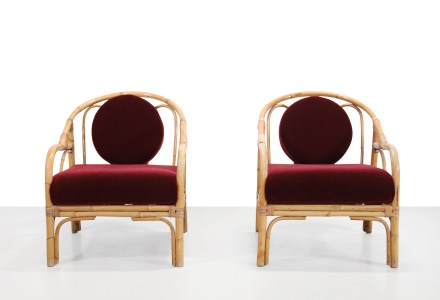 Set van 2 bamboo en rotan fauteuils met Bordeaux rood Mohair