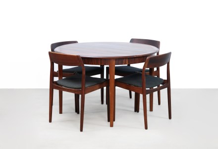 Vier Palissander Johannes Nørgaard eetkamer stoelen met verlengbare ronde tafel